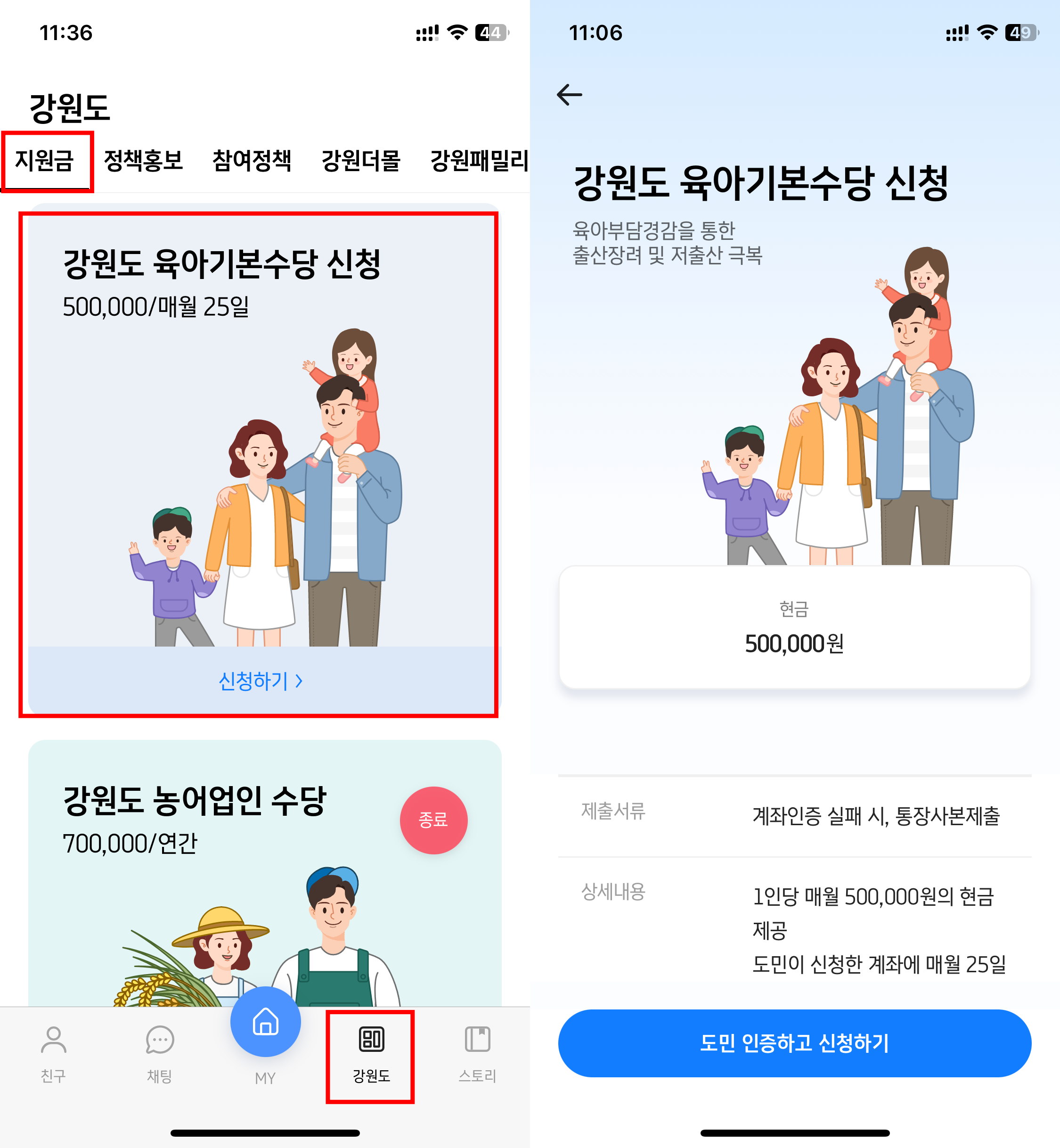 귀찮은 서류없이도 지원금 신청이 가능한 것이 바로 강원도 디지털플랫폼 우리도 강원도 어플의 장점입니다. 지원금 신청방법은 아래 하단에서 강원도 카테고리에서 지원금 카테고리에서 여러가지 지원금 신청을 바로 할 수 있습니다. 신청이 가능한 지원금을 보면 강원도 육아기본수당이 있습니다. 해당하신다면 계좌인증만 된다면 따로 서류없이도 신청할 수가 있습니다.