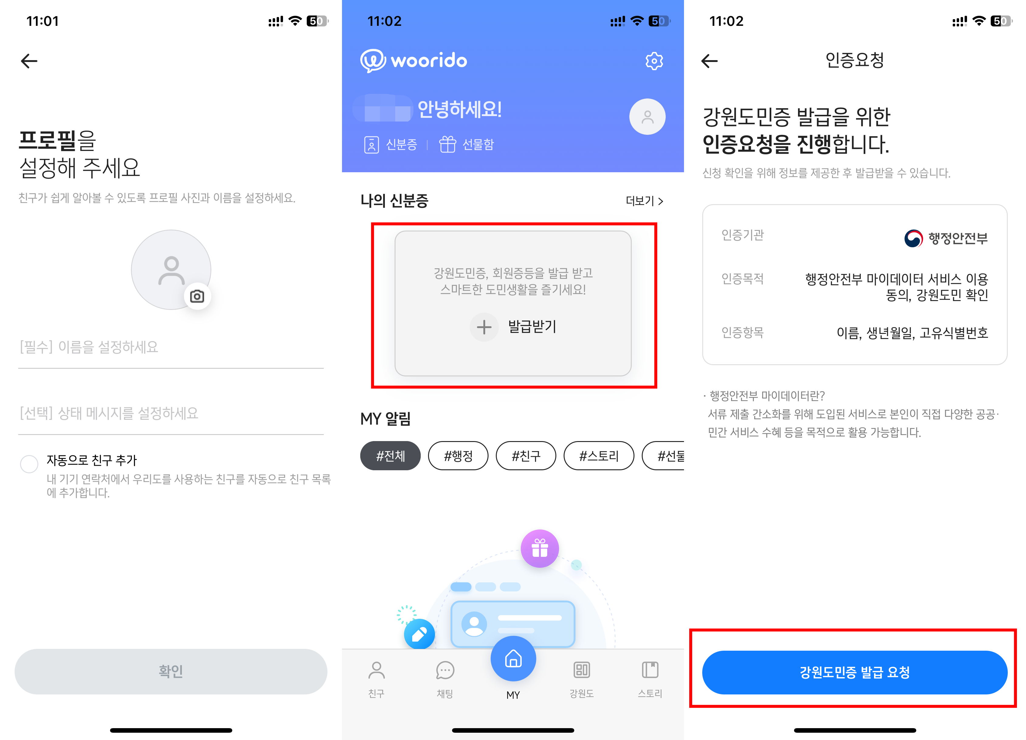 프로필 설정 후 강원도 지원금이나 여러가지 해택을 지원하기 위해 강원도민증을 발급을 발급해야합니다.