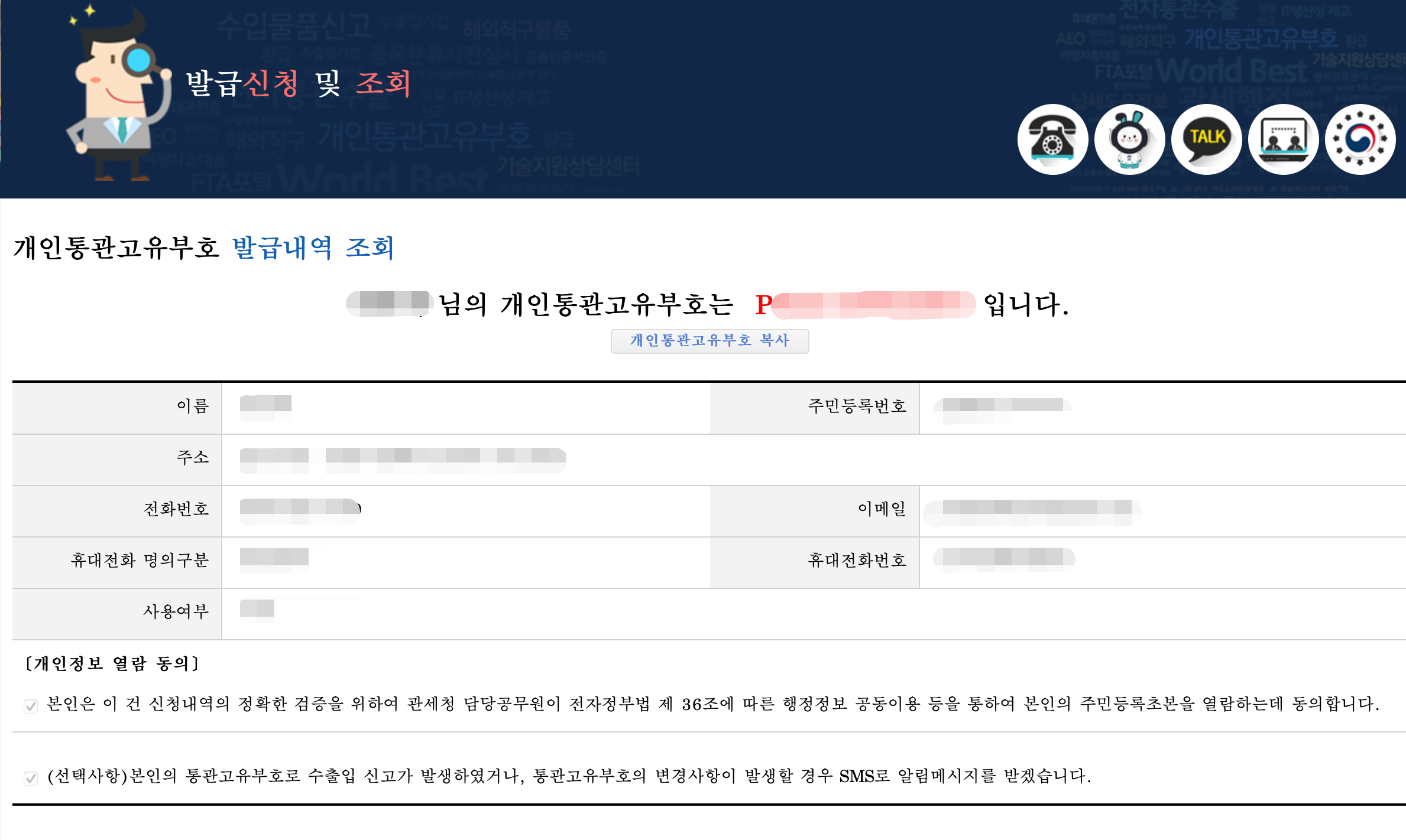 주소의 경우는 물건을 배송받을 주소가 아닌 주민등록상 주소를 입력하셔야합니다. 이렇게 입력된 주소와 전화번호는 변경이 되면 간단하게 변경이 가능합니다. 이렇게 본인인증과 주소, 전화번호 입력을 하면 개인통관고유부호 발급이 됩니다. 조회방법 또한 신규발급과 차이 없이 본인인증만 하면 바로 이전 개인통관고유부호 확인이 가능합니다.