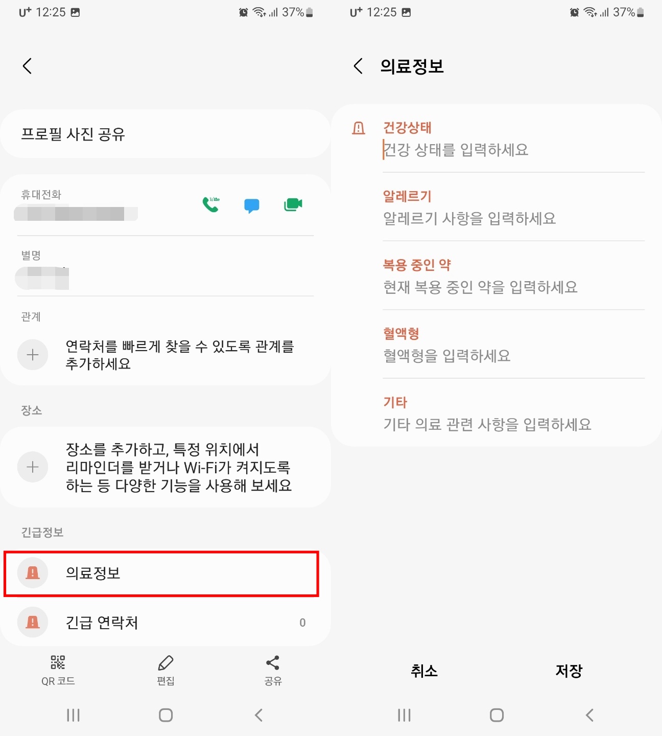 위에 알려드린 연락처에서 내 프로필에 들어가서 긴급정보에서 의료정보를 눌러서 들어가면 됩니다. 의료정보에는 건강상태, 알레르기, 복용 중인 약, 혈액형, 기타 관련 사항을 작성하여 위급 사항시 참고 할 수 있게 해주시면 되겠습니다. 갑각류 알레르기 같은 간단한 알레르기 같은 것을 작성하시면 되겠습니다.