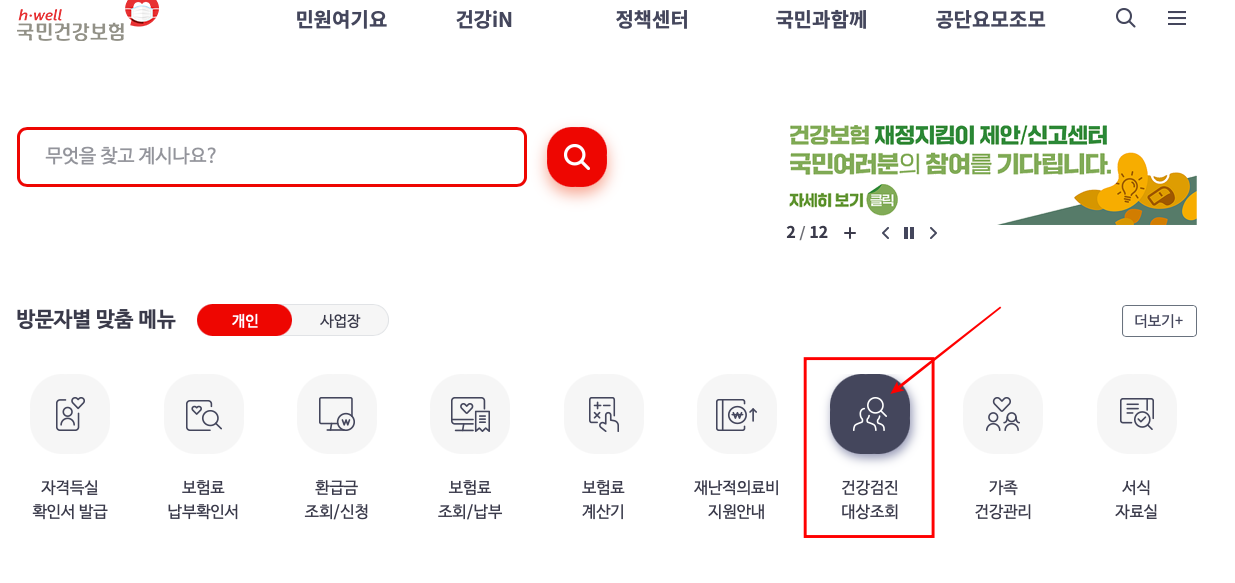 건강검진 대상자를 확인하기 위해서는 국민건강보험 홈페이지 메인 메뉴에서 건강검진 대상조회를 통해서 바로 확인이 가능합니다. 간편인증을 통해서 로그인하시면 됩니다.