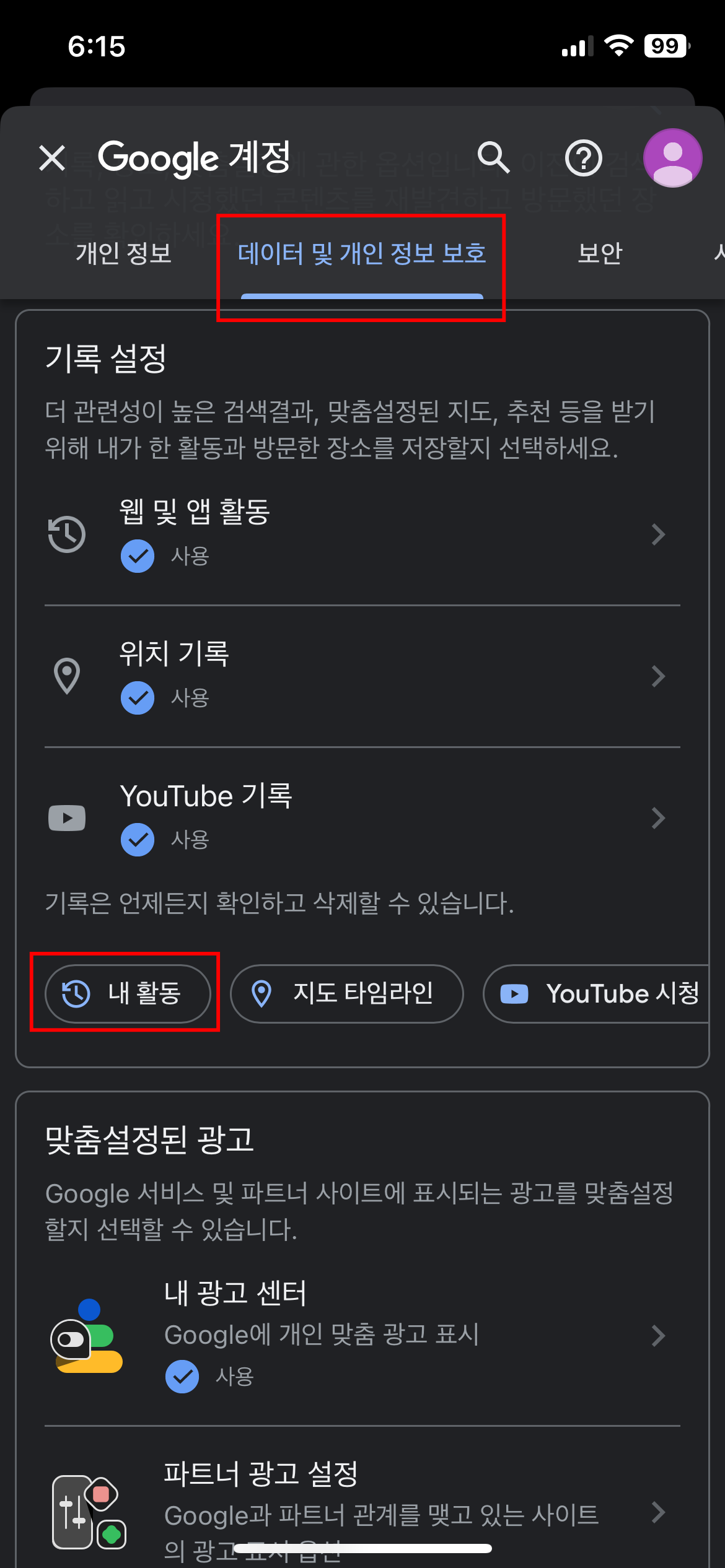 2. 데이터 및 개인정보 보호에서 내활동으로 들어갑니다.