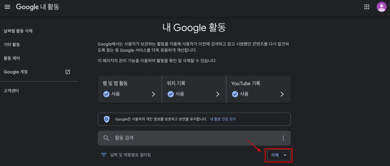 PC에서 구글 검색기록을 삭제는 구글 계정관리에서 삭제를 합니다.