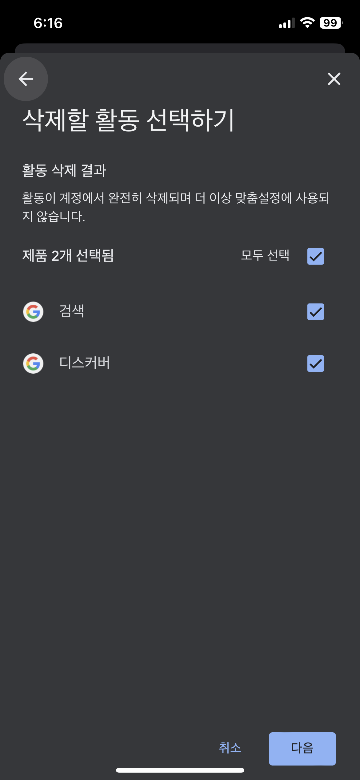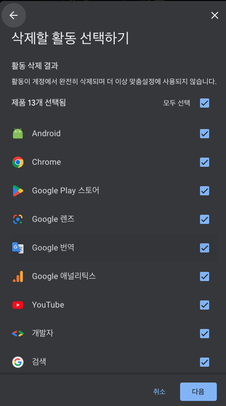 4. 삭제 기간과 활동을 선택하면 바로 삭제가 가능합니다.