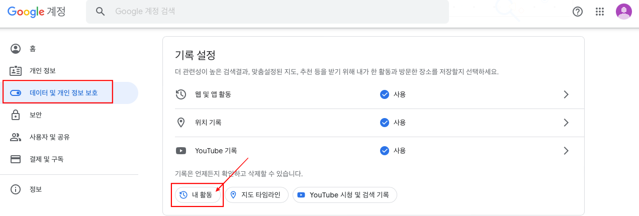 2. 데이터 및 개인정보 보호에서 내활동으로 들어갑니다.