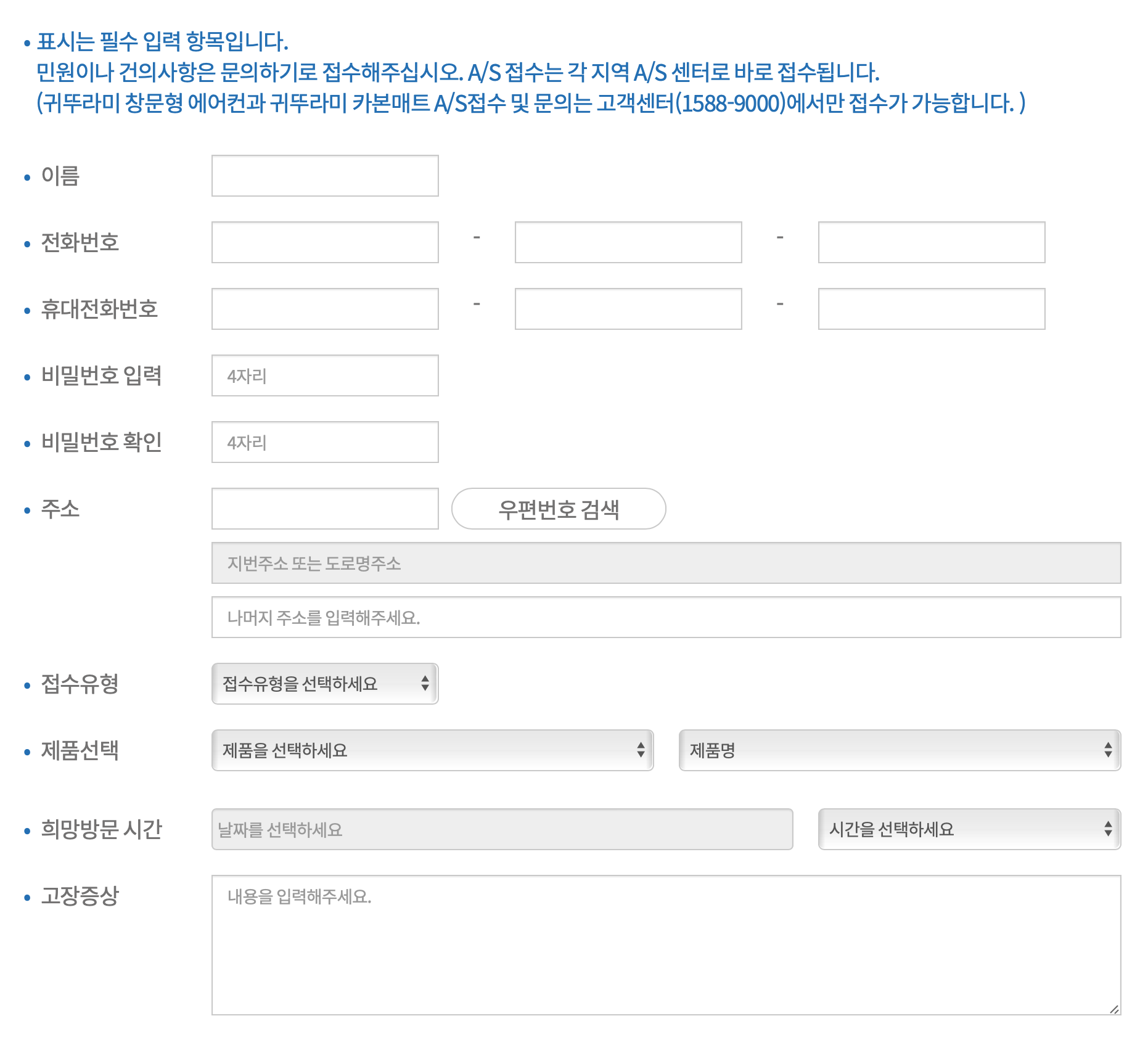카카오톡 접수를 추천하는 이유는 자동챗봇을 통해서 간편하가 자가진단 후에 바로 접수가 가능하며 관할지역 서비스센터에 바로 연결하여 엔지니어 확인하여 바로 서비스를 받을 수 있기 때문입니다.