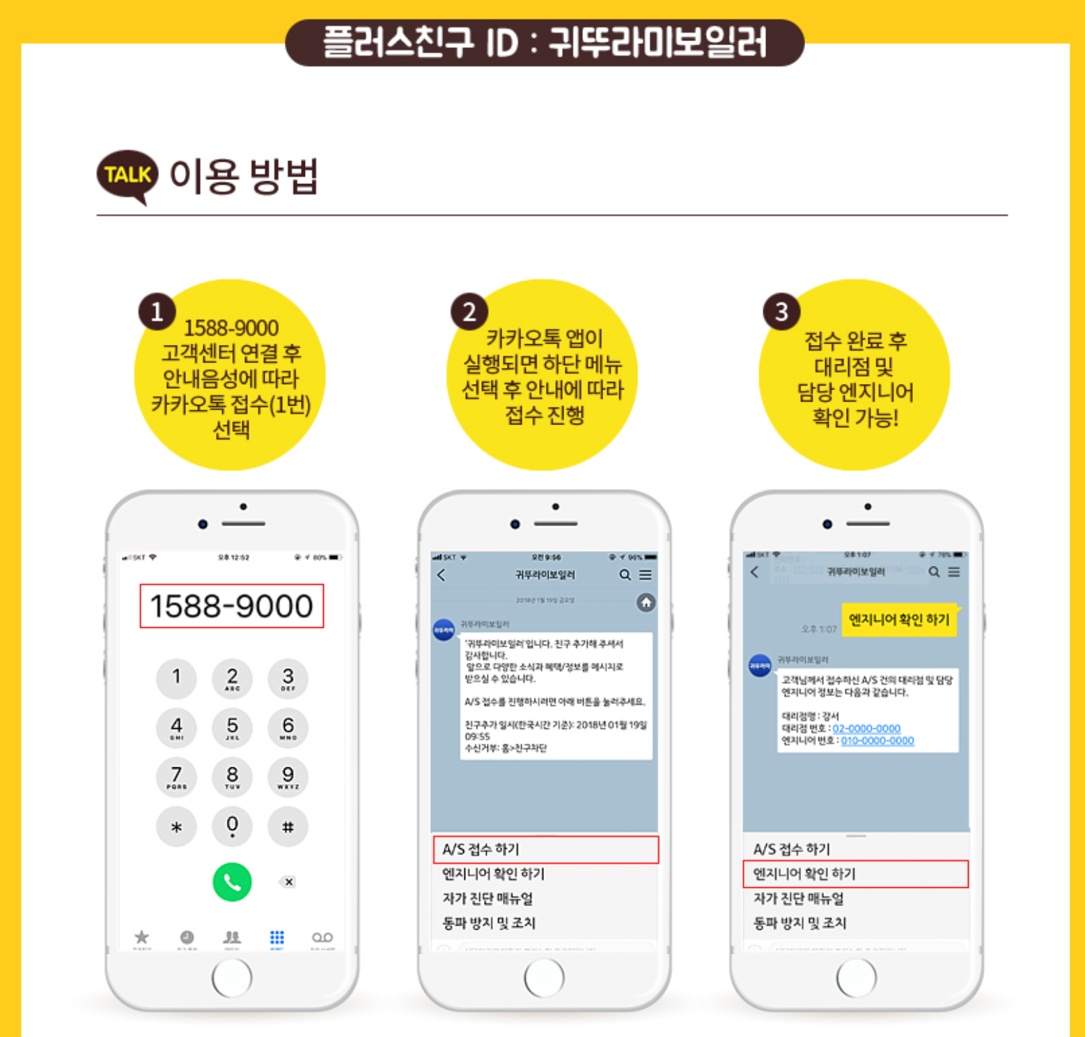 카카오톡으로도 간편하게 접수도 가능해졌습니다. 카카오톡 접수는 플러스친구 ID를 귀뚜라미보일러 검색하여 추가하시는 방법과 대표전화 1588-9000번에서 카카오톡 접수 1번을 선택하면 바로 연결해서 접수가 가능합니다.