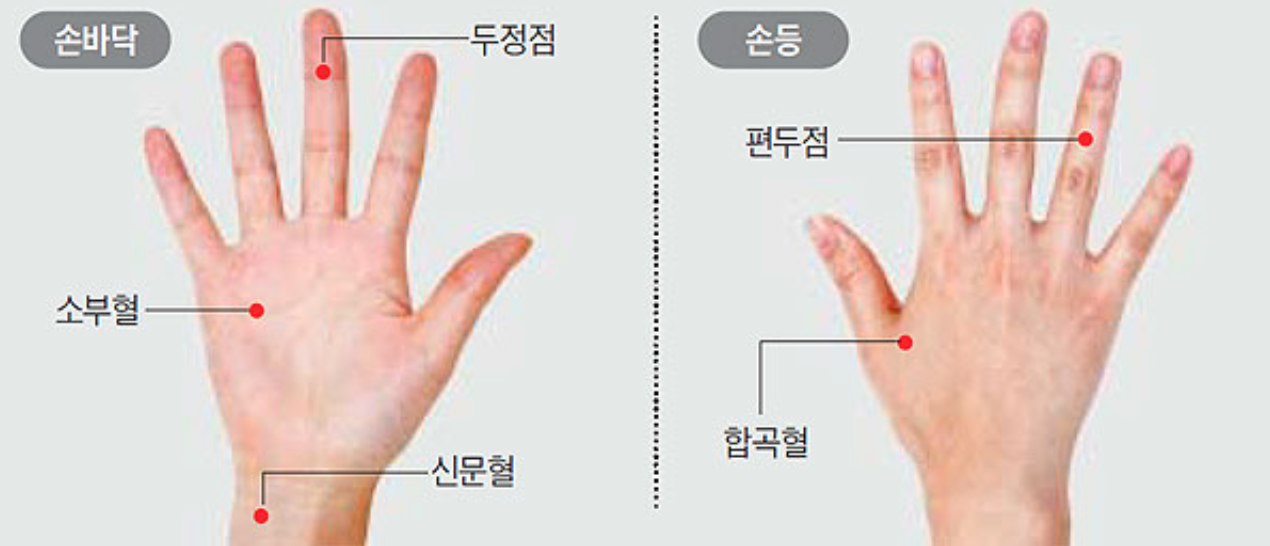 두번째는 혈자리 지압입니다. 가장 소화에 도움이 되는 혈은 합곡혈로 한의원에서는 급체를 했을 때 이곳에 침을 놓는 것으로 알려져 있습니다. 간단히 지압하는 것만으로도 소화에 도움이 많이 됩니다. 이때 지압하는 방법은 통증이 느껴질 정도로 강하게 눌러주어야만 도움이 되니 쎄게 지압해주는 것을 추천드립니다.