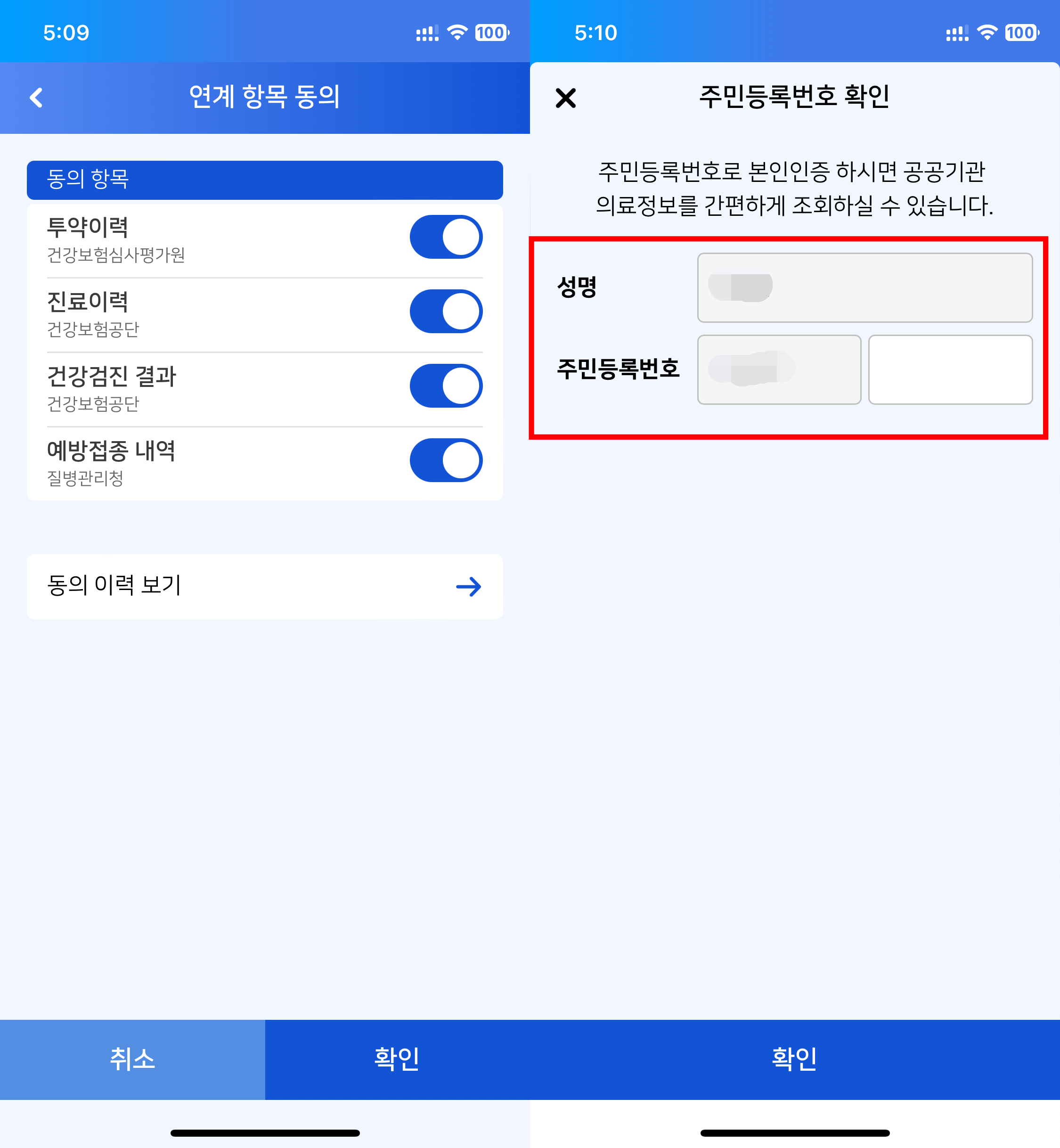 동의항목으로는 투약이력, 진료이력, 건강검진 이력, 예방접종 내역을 바로 연계할 수 있습니다. 마지막으로 주민등록번호 뒷자리를 꼭 한번 입력을 하셔야 확인이 가능합니다. 아무래도 나의건강정보는 중요한 개인정보인 만큼 여러 단계를 거쳐서 확인 할 수 있기 때문에 이런 부분에서는 조금 귀찮더라도 이런 인증절차를 걸치는게 좋다고 생각합니다.