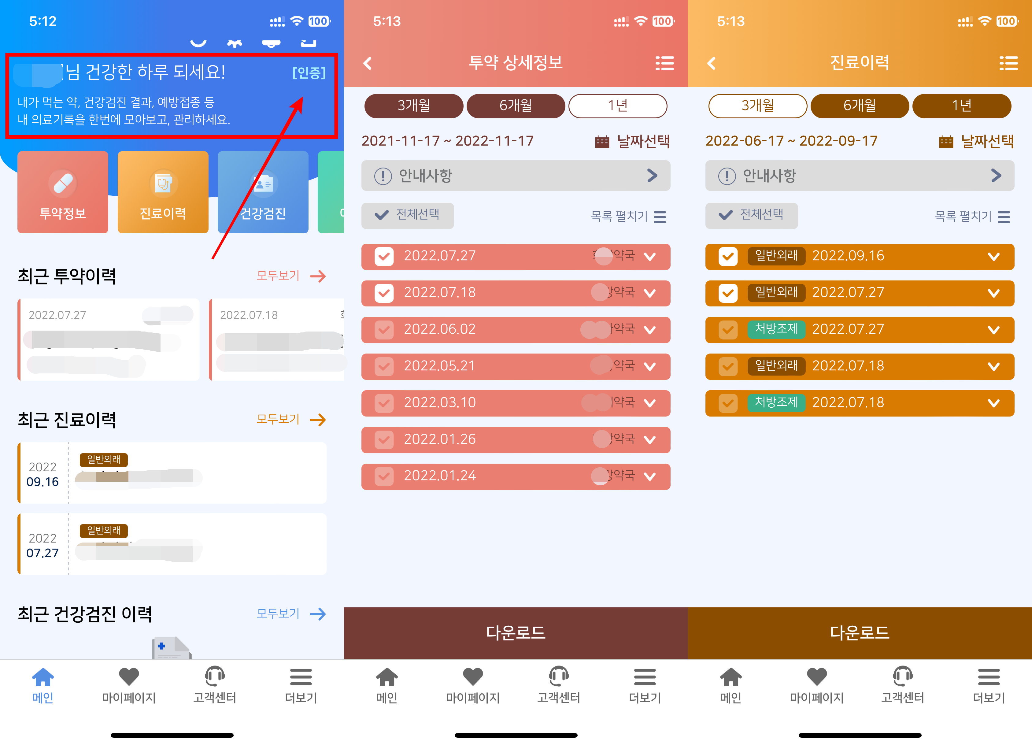 이렇게 모두 인증을 거치게 되면 모든 건강이력이 나오게 됩니다. 투약이력, 진료이력, 건강검진 이력이 한눈에 확인이 가능합니다. 그리고 자세하게 확인한다면 원하는 정보를 다운로드 받을 수 있습니다.