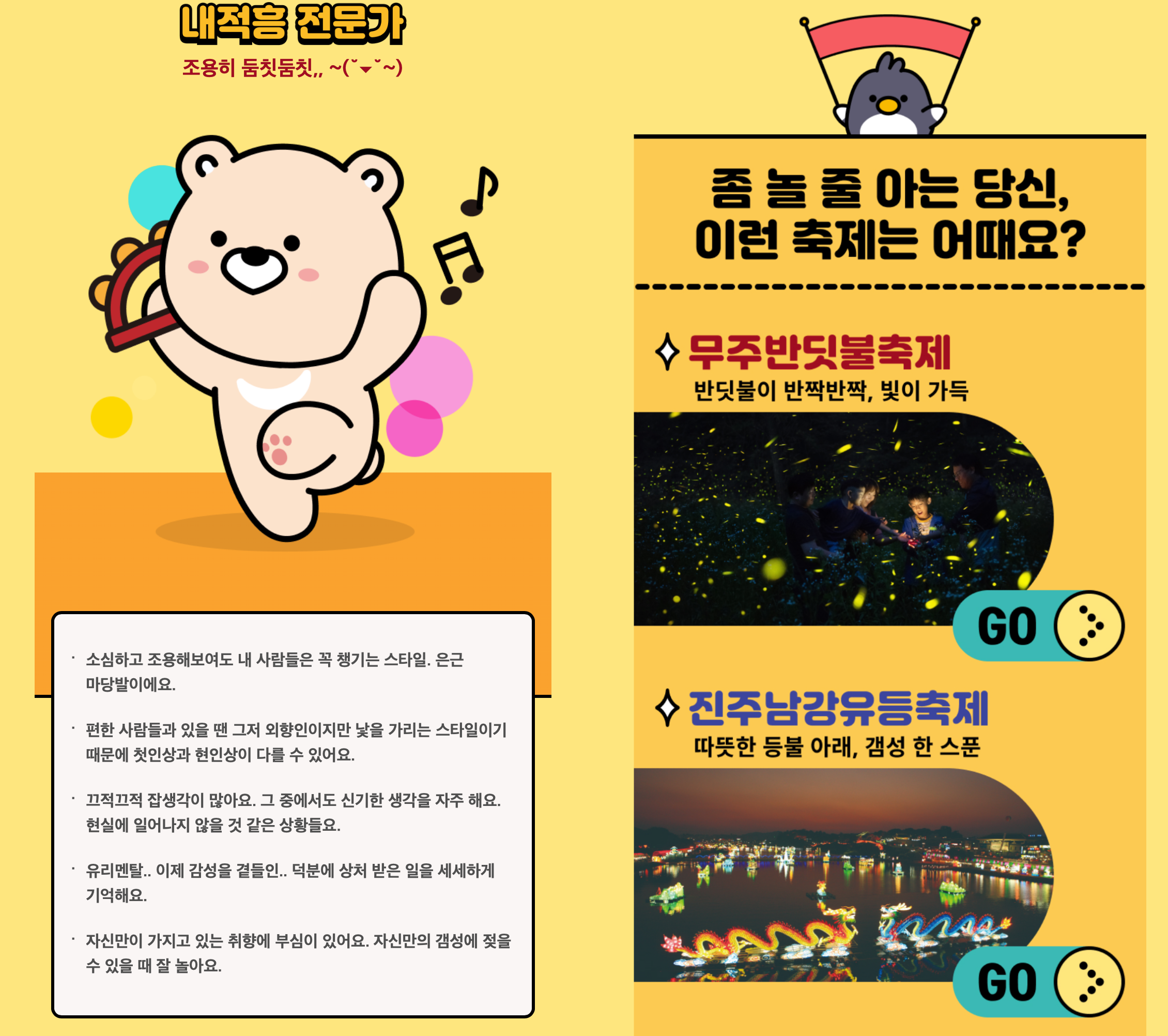 문항을 보면 질문에 대한 대답이 딱 두가지 선택으로 되어 있다보니 간단하게 선택이 가능해서 좋았습니다. 저도 약 1분만에 노는 유형 MBTI 테스트를 해보았습니다. 저는 내적흥 전문가가 나왔습니다. 조용히 둠칫둠칫 하는 스타일이군요. 은근 설명하는 것들이 많이 맞아서 재미가 있었습니다. 그렇게 노는 유형 MBTI 결과와 함께 축제를 추천해주는데요. 원하는 축제의 정보를 바로 확인 할 수 있는 링크도 남겨주어서 재미가 있었습니다.