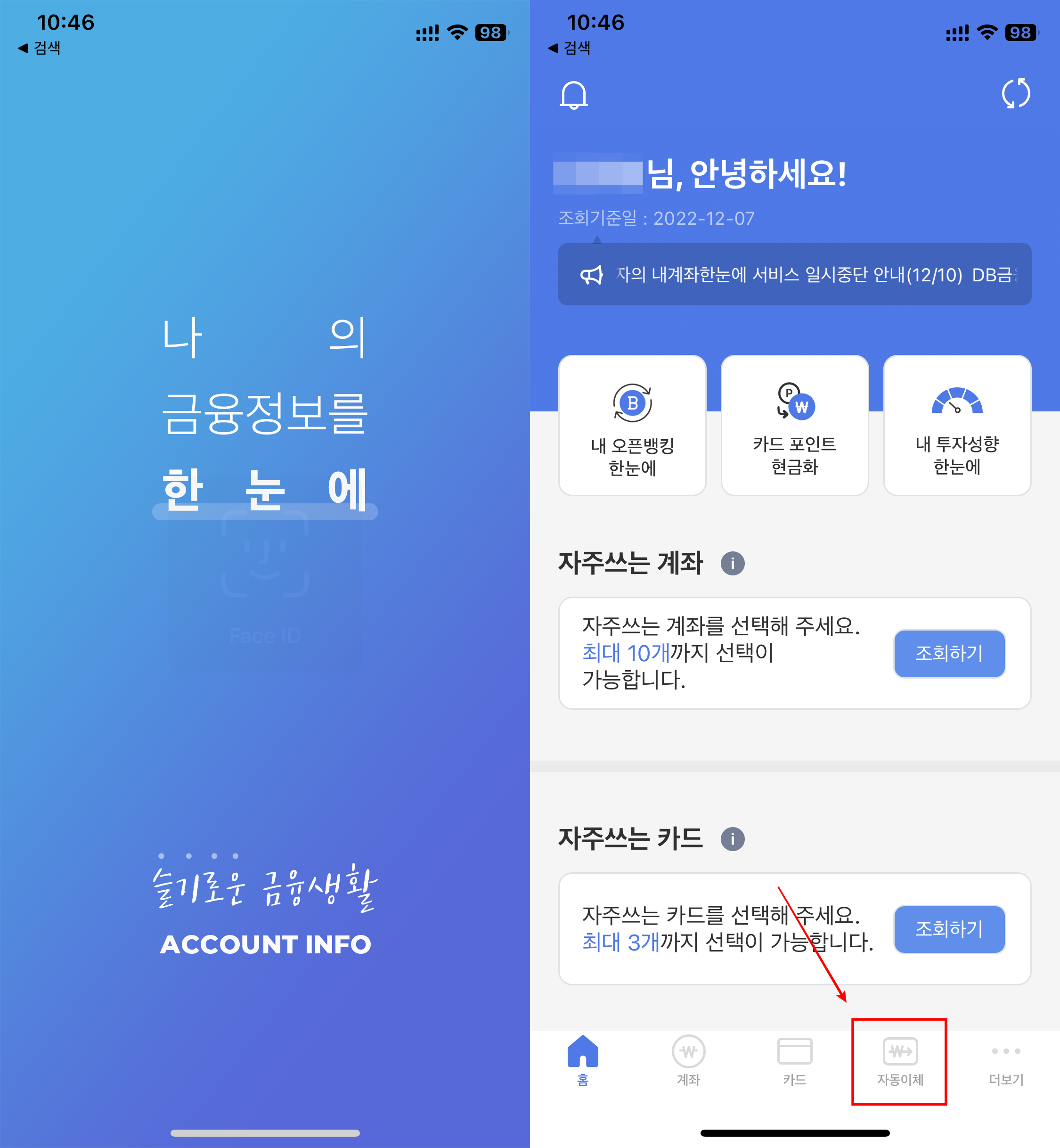 위 링크를 통해서 어플을 설치하면 처음에는 로그인을 해야합니다. 요즘은 간편인증을 통해서 쉽게 로그인을 할 수 있으니 걱정은 하지 않으셔도 됩니다. 어카운트 인포를 아래 메뉴에 자동이체 바로가기로 접속을 하면 됩니다.