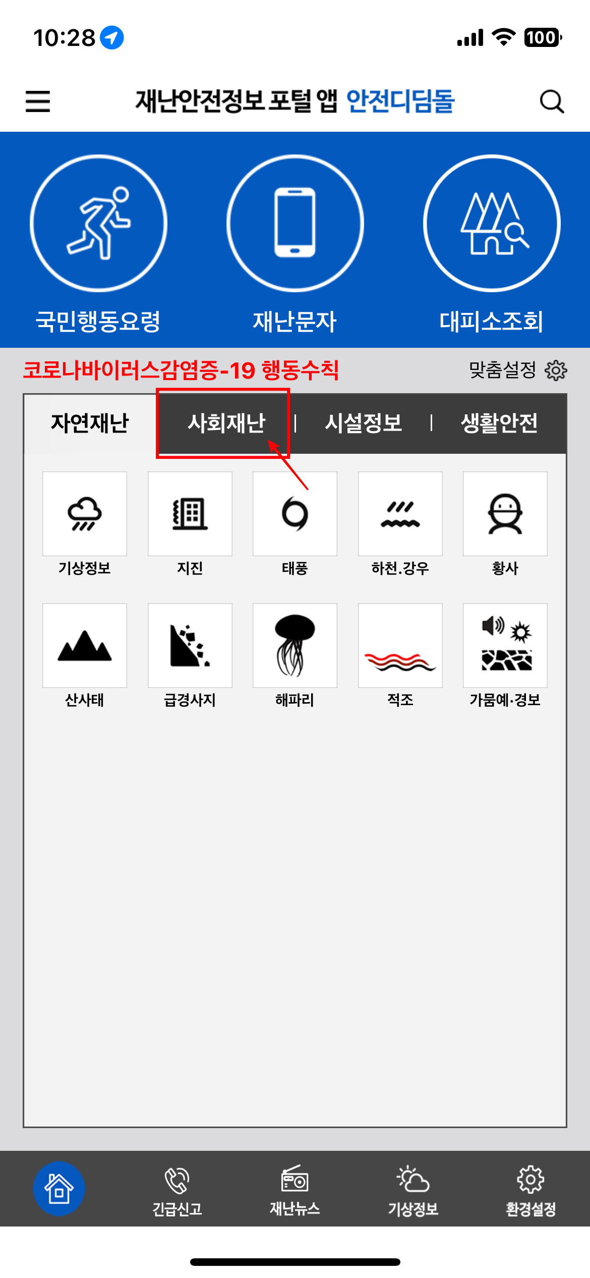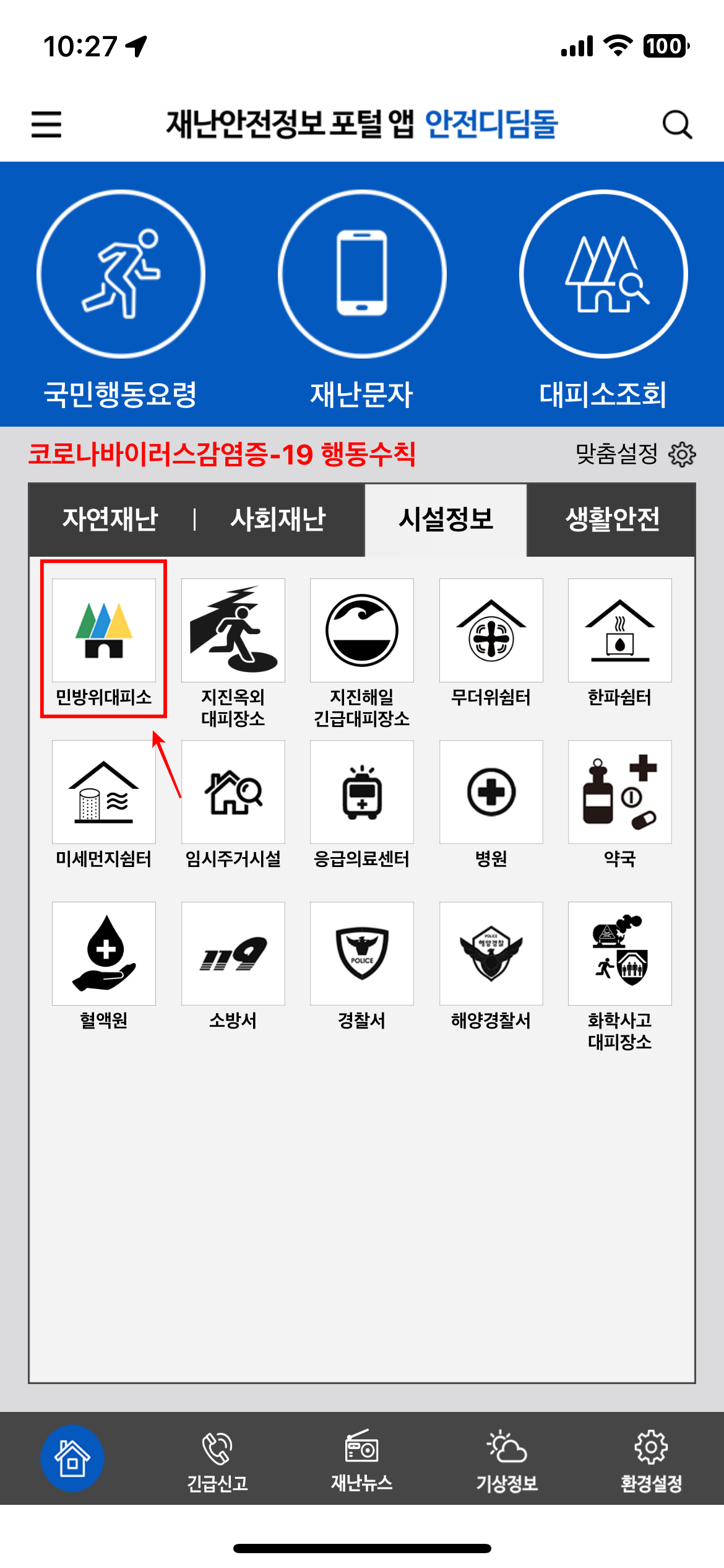 가장 빠르게 비상대피소 위치를 파악하는 방법은 국가에서 지원하는 어플로 확인하는 것입니다. 안전디딤돌이라는 어플인데요. 간단히 소개해드리겠습니다. 안전디디돌을 다운로드 후 실행하시면 여러가지 상황에 따른 대피소를 확인이 가능합니다. 바로 대피소 조회를 하시면 민방위대피소를 확인이 가능합니다. 다양한 상황에 따른 대피소를 확인하기 위해서는 사회재난을 터치하시면 민방위, 지진, 해일, 무더위, 한파, 미세먼지 대피소 등을 편하게 확인이 가능합니다.