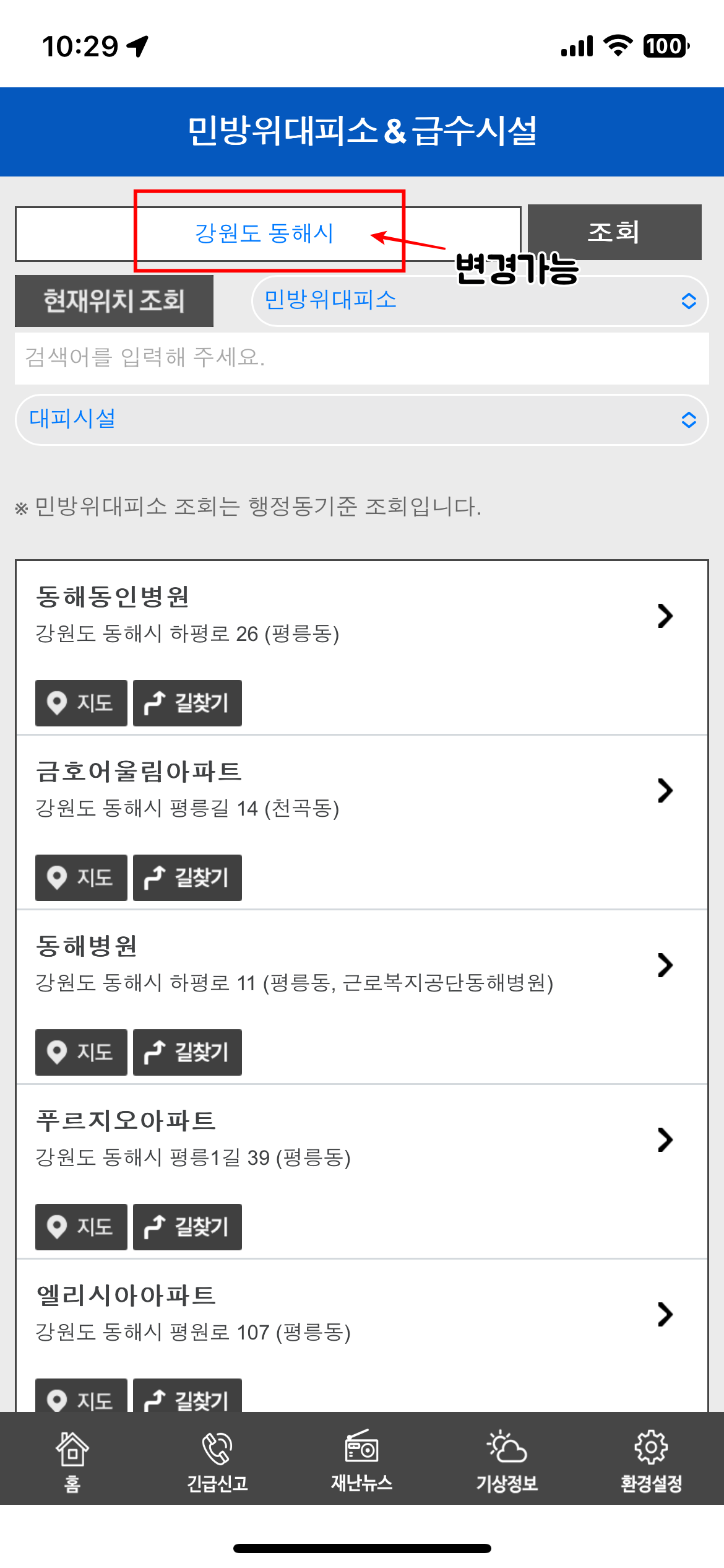 안전디딤돌에 대한 위치정보를 허용해 주시면 자동으로 조회가 가능합니다. 물론 여기서 위치를 바꿔서 조회가 가능한데요. 민방위 대피소의 경우는 병원과 아파트가 나오게 되는데요. 일반 아파트나 병원에 들어간다는 것이 아니라 지하 주차장에 대피할 수 있게 되는 것이니 참고하시길 바랍니다. 민방위의 경우 미사일 경보등이 기 때문에 위로 올라가는 것이 아니라 지하로 대피하시길 바랍니다.