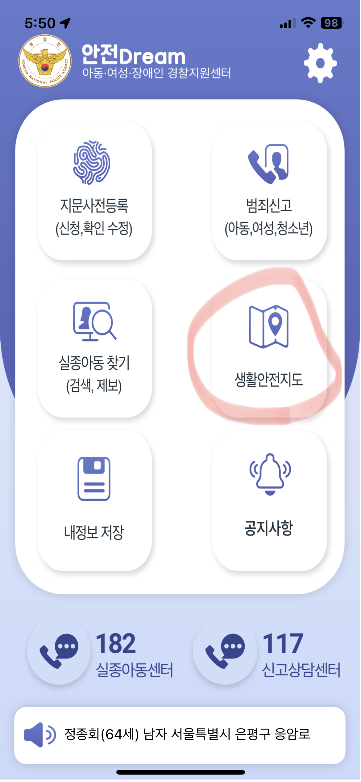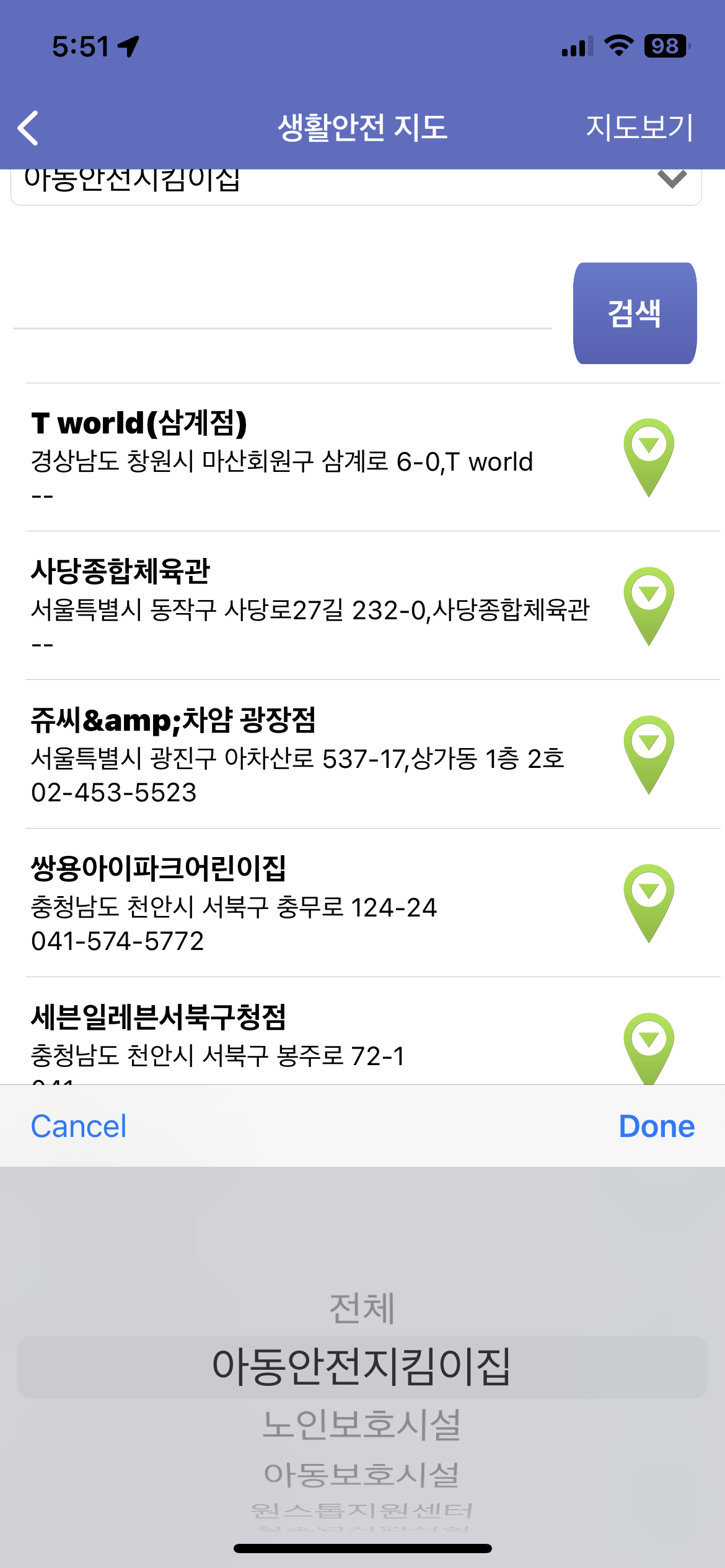 모바일의 경우도 위 링크로 접속해서 볼 수있긴하지만 최적화된 방법으로 볼려면 어플을 이용하시면 더 쉽게 확인이 가능합니다. 어플에서 생활안전지도로 들어가서 아동안전지킴이집을 선택한 뒤에 지도보기로 확인이 가능합니다. 지도에 표시된 곳이 아동안전지킴이집이며 터치로 들어가면 연락처 및 위지정보도 받을 수 있으니 참고 하시길 바랍니다.