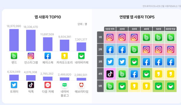 네이버밴드는 모임에 최적화 되어 있는 SNS라고 할 수 있습니다. 오픈형보다는 폐쇄형에 가까운 SNS라 할 수 있겠습니다. 물론 검색을 하면 다 나오기 때문에 완전한 폐쇄형이라고는 할 수는 없지만 자세한 정보를 위해선 그 밴드에 가입을 해야만 볼 수 있는 것도 많기 때문에 이런 부분은 밴드의 특징이라고 할 수 있겠네요. 최근에는 모임뿐만 아니라 여러가지 물건을 파는데에도 하나의 인터넷 매장으로써의 역할도 담당하고 있는 것을 볼 수 있습니다. 그리고 아무래도 이용하는 나이대가 40대 이상에서 많이 사용하는 것을 볼 수 있습니다. 아래는 국내 SNS 앱사용자 순위와 연령별 앱 사용자 순위입니다. 참고하시면 되겠습니다.