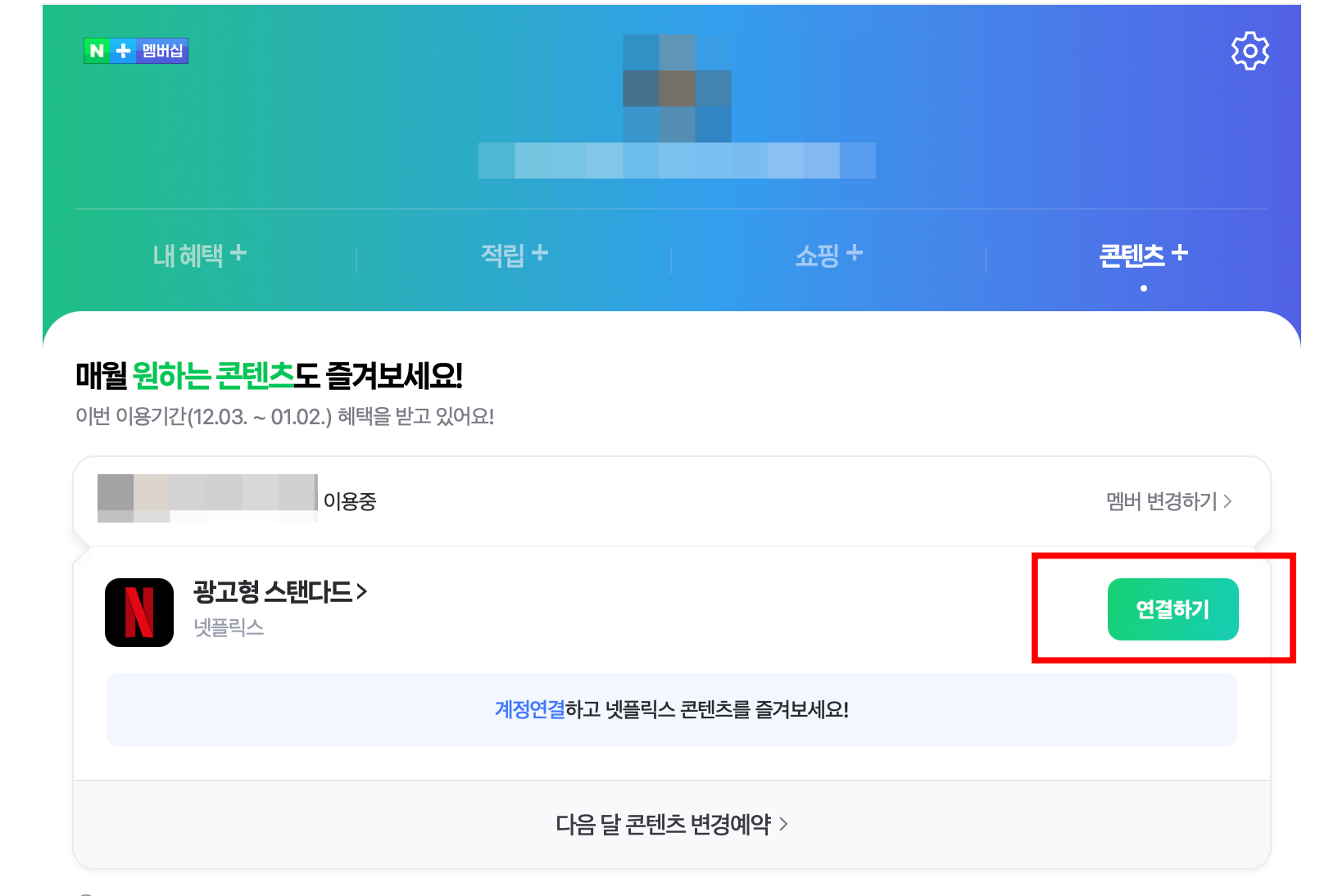 위 링크로 접속을 하여 네이버플러스 멤버십 접속을 하여 콘텐츠에서 넷플릭스 연결하기를 선택합니다. 이때 이전에 다른 컨텐츠를 사용중이였다면 다음 달에 변경이 가능합니다.