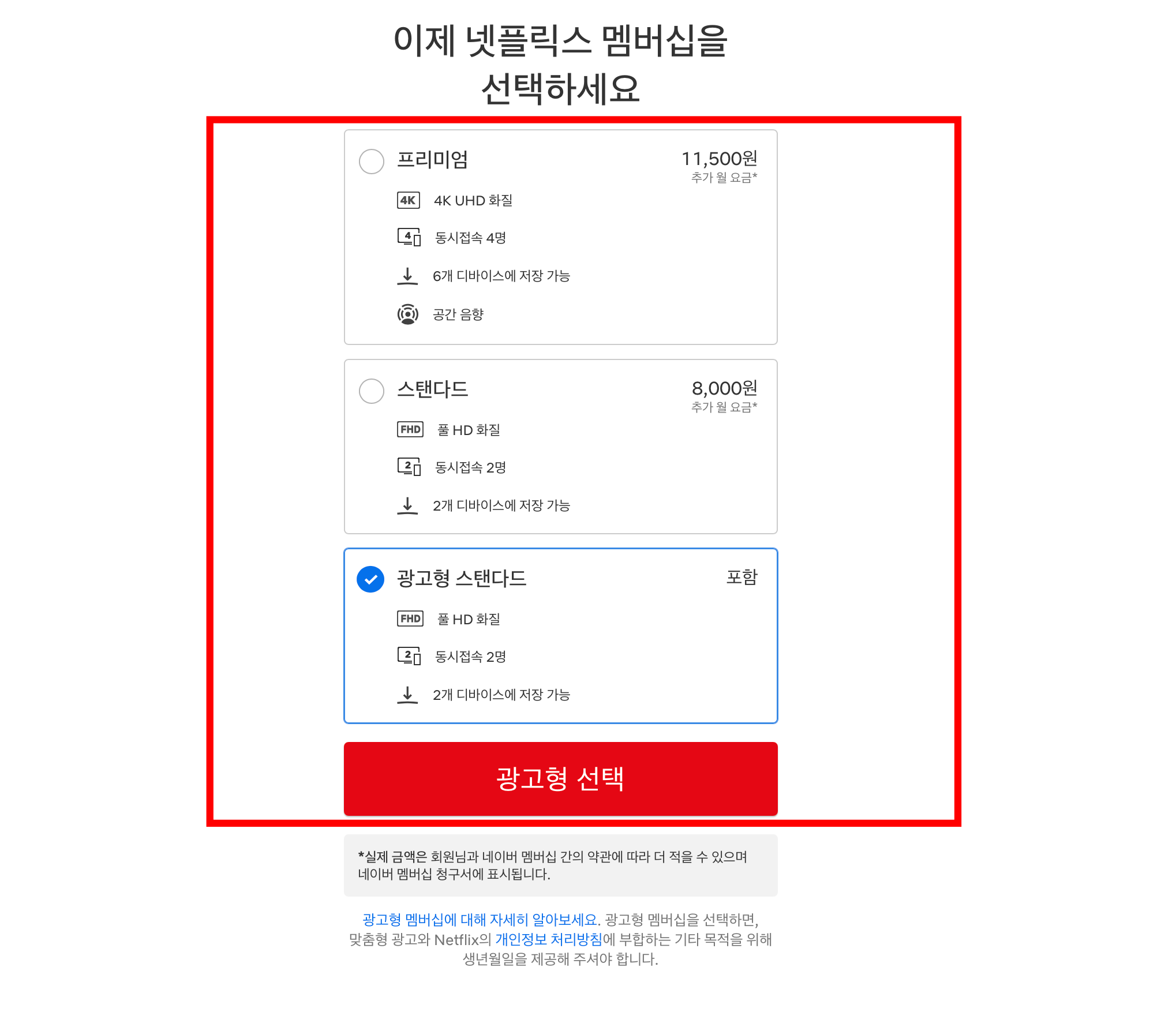 넷플릭스 계정의 멤버십을 선택이 가능합니다. 광고형 스탠다드는 무료로 사용이 가능하며 상위 버전의 경우에는 추가 요금을 지불하면 더 저렴하게 이용을 할 수 있습니다. 5,500원을 할인 받아서 이용을 할 수있습니다.