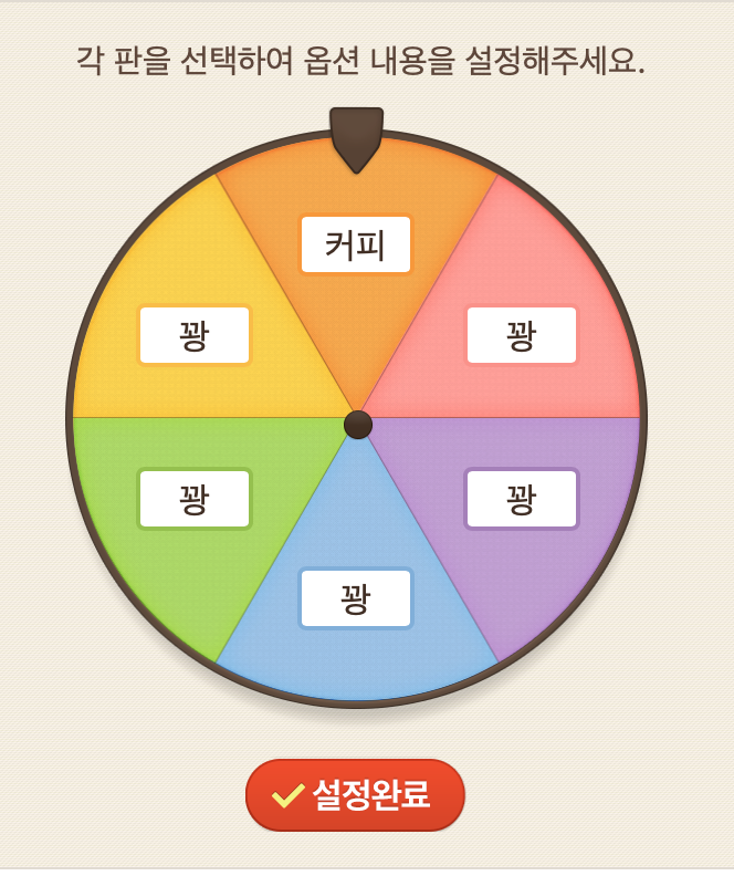 돌림판 확률을 조정하는 방법을 알려드리겠습니다. 만약 4명이서 돌림판을 돌리게 된다고 가정하였을 때 4칸으로 돌림판을 돌리게 되면 동일한 확률로 각 사람당 25%의 확률을 가지게 되는데요. 만약 5칸으로 늘리고 한명의 이름은 2칸을 입력하게 되면 각 칸당 20% 확률이지만 한명은 40%의 확률을 가지게 되는 것입니다. 이런 식으로 확률을 조정하는 방법은 인원 수보다 더 많은 칸을 이용해서 칸수를 조절하는 것으로 돌림판 확률을 조정할 수 있으니 이런 방법도 한번 이용해보시길 바랍니다.