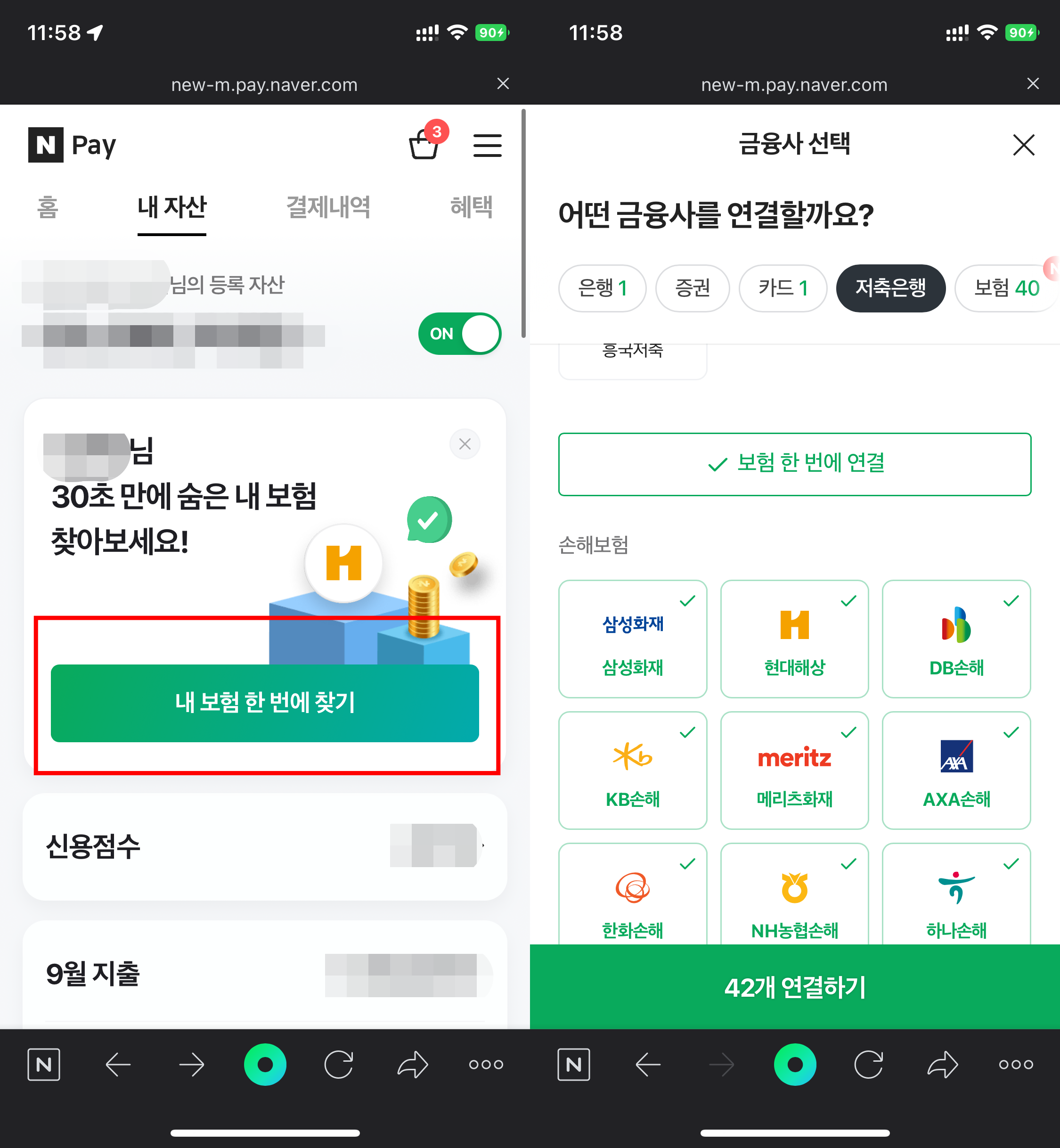 네이버 신용점수 무료조회와 신용점수 올리기를 이용해보셨나요? 그렇다면 또 다른 무료 서비스인 숨은 보험 찾기도 한번 이용해보시길 바랍니다. 네이버 숨은 보험찾기는 내가 모르는 보험을 찾고 겹치는 보험은 없는지 확인해서 정리할 수 있게 도와줍니다. 위에 네이버 신용점수 무료 조회를 이용하셨다면 따로 추가 인증없이 바로 30초만에 사용할 수 있는 서비스이니 한번 조회해보시길 바랍니다.