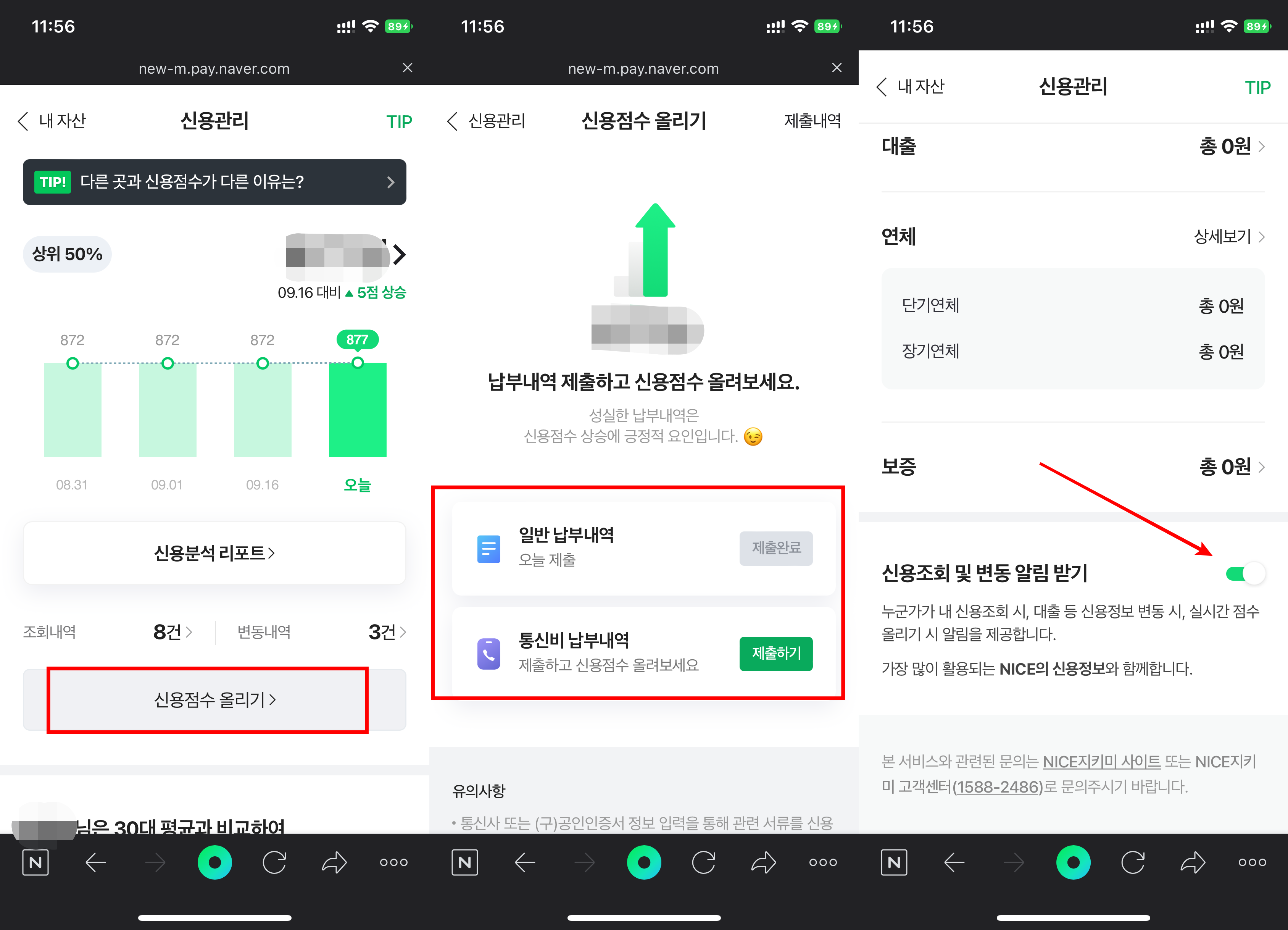 네이버에서는 신용관리 기능중에 신용점수 올리기 서비스를 지원하고 있습니다. 내자산 탭에서 신용관리로 들어가게 되면 신용분석 리포트 아래에 신용점수 올리기가 있습니다. 신용점수를 올리기 위해서는 서류를 제출해야합니다. 그런데 일일히 서류를 떼서 제출하는 것이 아니라 일반 납부내역 제출하기 누르면 내 신용정보를 이용해서 자동으로 제출하여 신용점수를 올려줍니다. 그리고 통신비 납부내역을 참부하게 되면 신용점수를 올리는데에 도움이 됩니다.