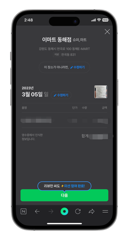 등록하려고 한 영수증을 찍고 나면 인식을하고 어떤 내역이 나오는지 확인이 가능합니다. 여기서 리뷰를 쓰면 간단하게 인증이 가능한데요. 영수증 인증시에는 굳이 리뷰를 작성하지 않고 간단하게 3가지 정도를 선택해서 등록이 가능합니다.
