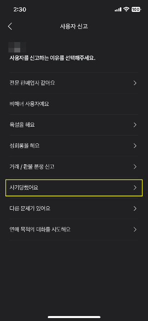 사기로 의심되는 판매자 또는 구입자의 프로필을 터치합니다. 오른쪽 상단 점 세개를 누르고 신고하기를 들어갑니다.