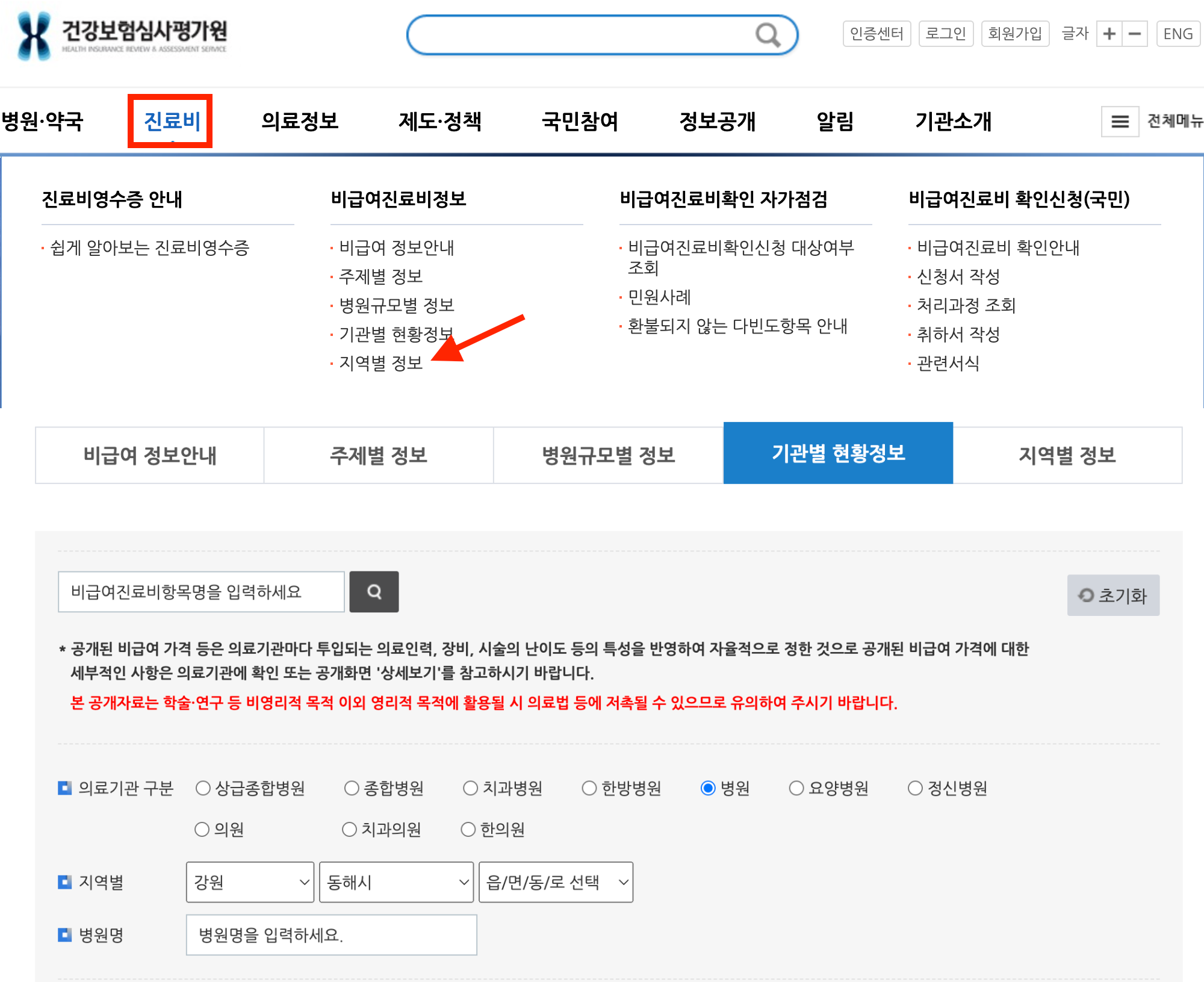 진료비 - 비급여진료비정보 -  지역별정보 / 기관별 현황정보로 보는 것을 추천드리겠습니다.