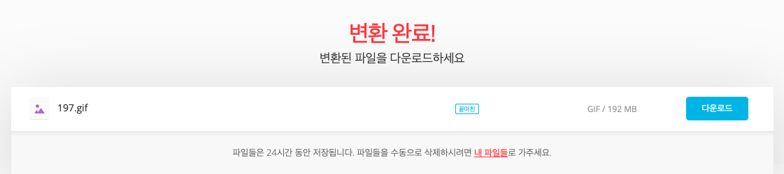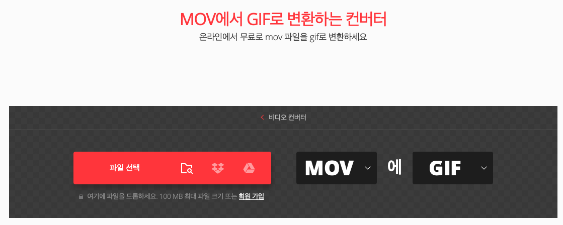 파일은 최대 100Mb까지 가능하며 파일선택해서 업로드 후 변환만 누르면 쉽게 변환이 가능합니다. 여기서 좀 아쉬운 부분은 따로 길이 조절이나 용량 조절이 안된다는 점 입니다. 영상파일의 크기를 첨부터 조절해서 변환을 해야합니다.