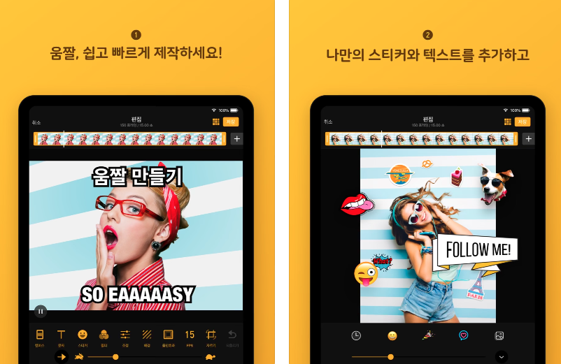 두번째 추천하는 방법은 어플을 이용하는 것인데요. 움짤을 만드는 가장 대표적인 어플로 여러가지 기능은 물론 원하는 길이와 용량을 세부적으로 조절할 수 있습니다. 자막을 넣거나 스티커도 넣을 수 있어서 멋진 움짤을 만들 수 있어서 가장 추천하는 어플입니다.