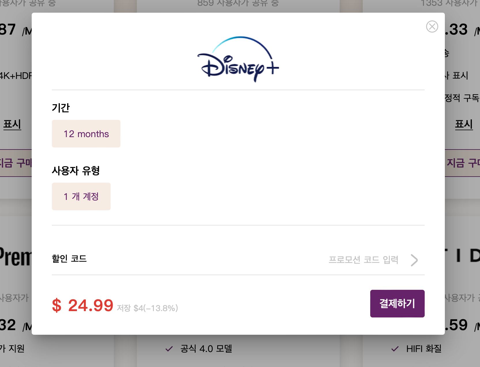 위 바로가기로 접속을 하시면 OTT 공유 사이트인 고잉버스에 접속할 수 있습니다. 현재 디즈니플러스의 경우 월 2.08달러로 이용을 할 수 있습니다. 지금 구매하기를 누르시면 12개월로 바로 결제가 가능합니다. 그런데 여기서 추가 할인받을 수 있는 방법이 있습니다.