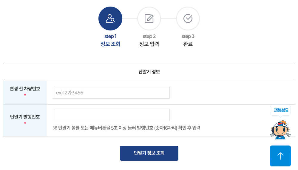 이제 차량번호와 단말기 발행번호를 입력하여 정보를 조회 후에 명의변경이 가능합니다. 가장 어려운 것이 룸미러 하이패스 단말기 발행번호였으니 이것만 해결하면 간단히 명의변경을 할 수 있습니다.