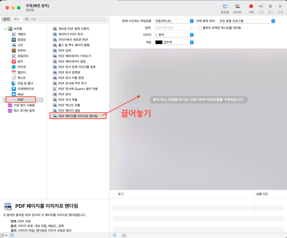 3. 실행된 Automator에서 PDF - PDF 페이지를 이미지로 렌더링을 작업창에 끌어놓습니다.