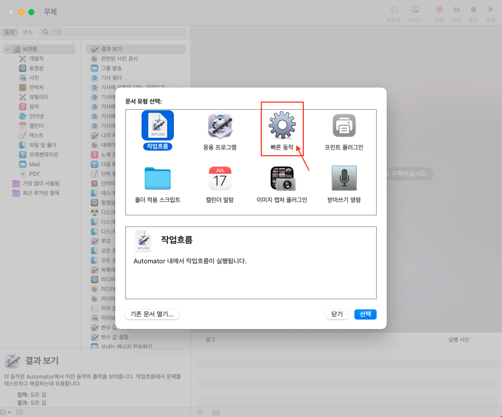 2. 실행된 Automator에서 빠른동작을 선택하여 추가합니다.