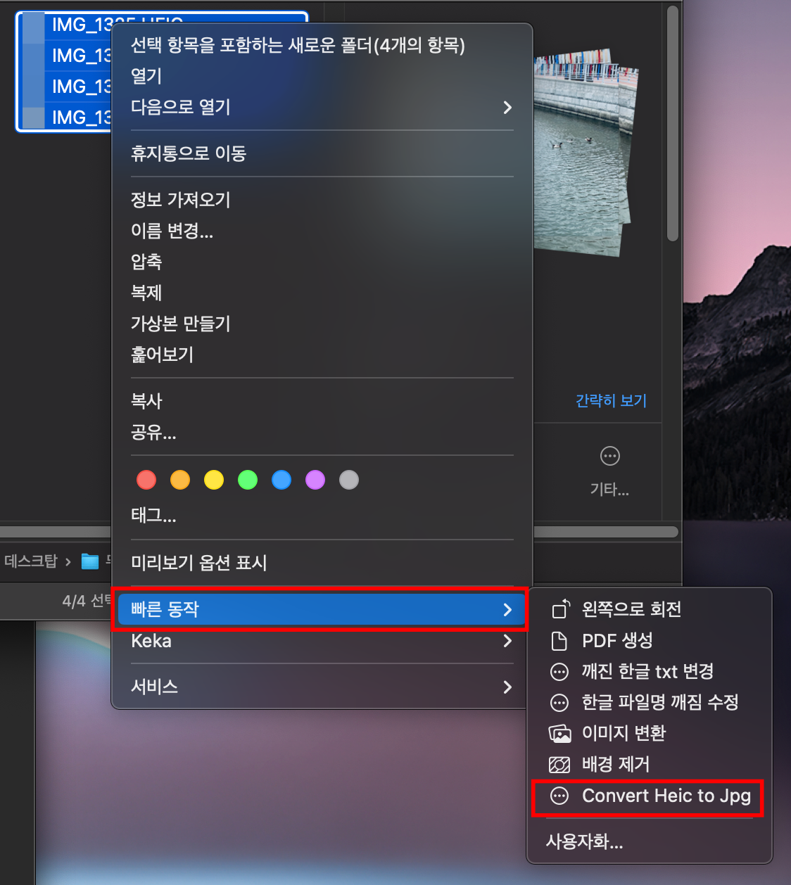 7. 변환하고자 하는 HEIC 사진파일 우클릭 후 빠른동작 - 설정한 명령어 선택합니다.