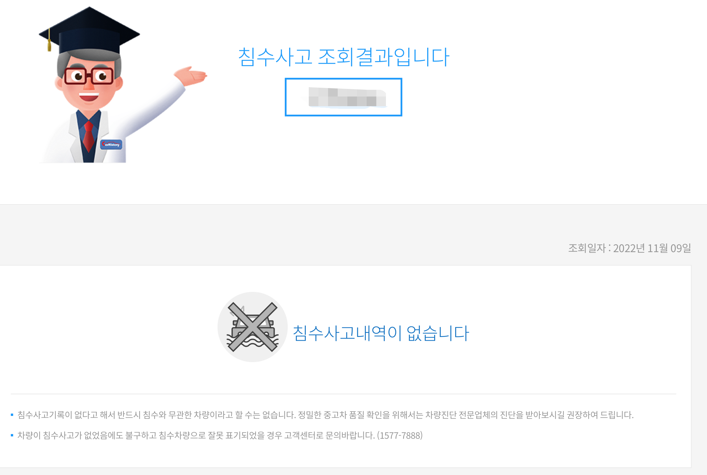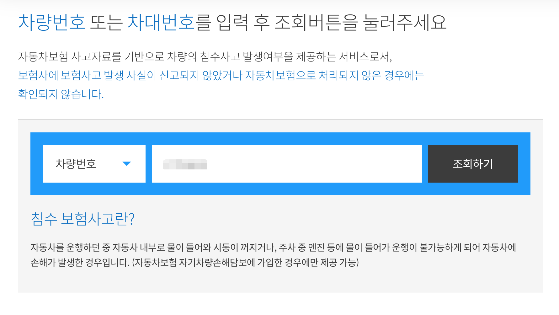 차량번호나 차대번호를 입력하면 아주 빠르게 조회결과를 확인할 수 있습니다. 이 결과는 보험사에 신고가 되었는지 여부에 따라 조회 결과가 나오게 됩니다. 침수사고는 엔진 내에 물이 들어가게 되어서 차량 운행이 불가능하게 된 경우를 말합니다. 이 경우 보험사에 신고가 되지 않으면 조회 결과로 나오지 않는다는 단점이 있습니다. 이런 경우 침수차량을 확인하는 추가 방법도 알아보겠습니다.