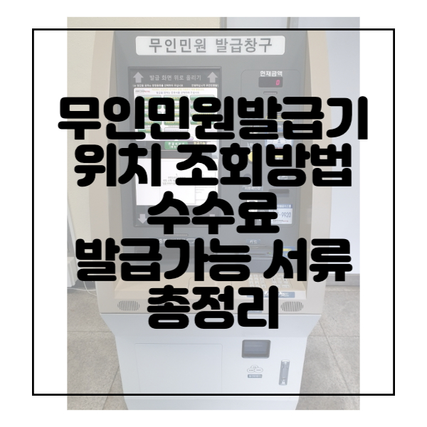 무인민원발급기는 행정문서를 간편하게 발급을 받을 수 있는 서비스입니다. 관공서 뿐만 아니라 다른 여러 곳에 무인민원발급기가 설치가 되어 있어서 급하게 서류를 출력을 해야 할 때 사용할 수 있습니다. 그런데 무인민원발급기가 행정복지센터에만 있다고 알고 있는 분들이 많은데요. 우리 주변에는 생각보다 많은 곳에 무인민원발급기가 있습니다. 어디에 있는지 간편하게 조회하는 방법과 함께 수수료와 발급 가능 서류까지 정리해서 알려드리겠습니다.