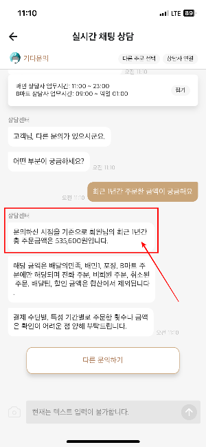 주문 말고 다른 문의가 있어요 - 최근 1년간 주문한 금액이 궁금해요.