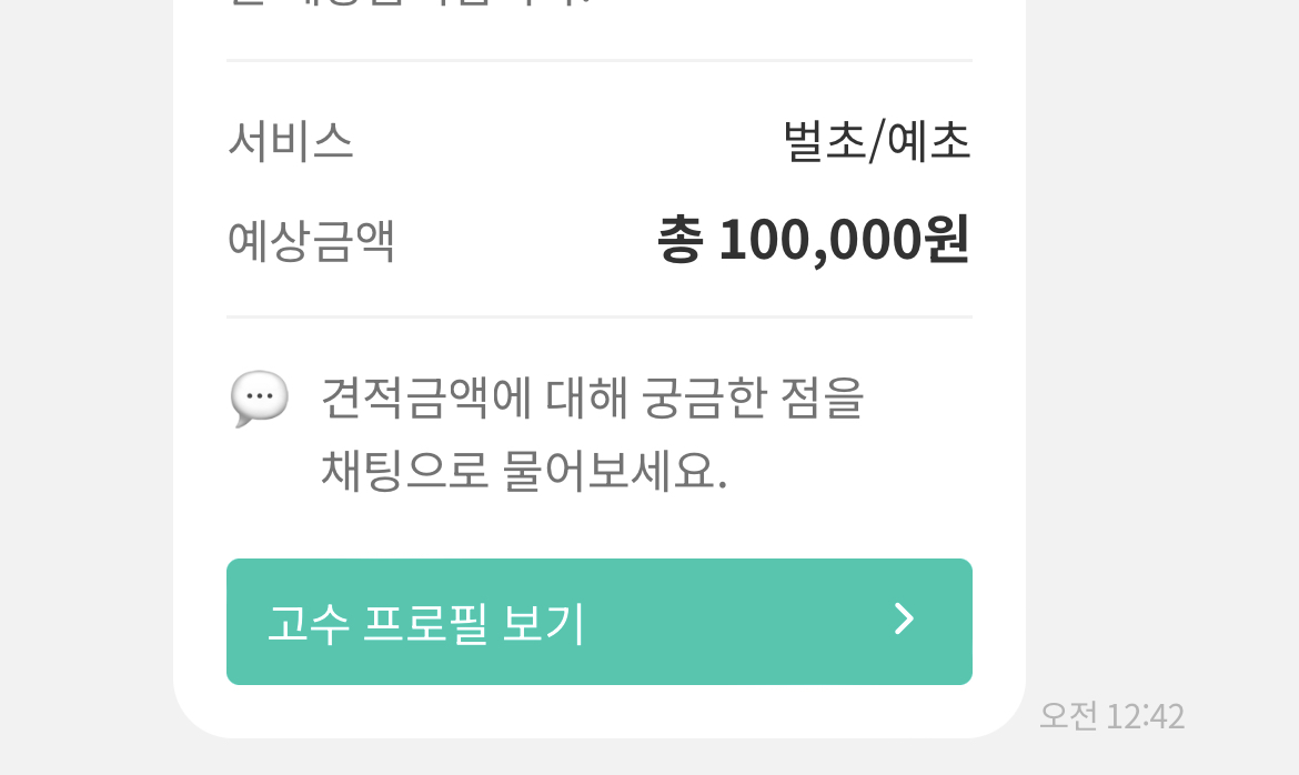 제가 직접 견적을 받아 보았는데요. 사이트에서 바로 입력을 해보았을 때는 150,000부터 가격이 나왔다보니 비슷하구나 생각이 들었는데요. 추가적으로 전문가에게 연락이 온 견적은 100,000원으로 먼저 나왔습니다.
