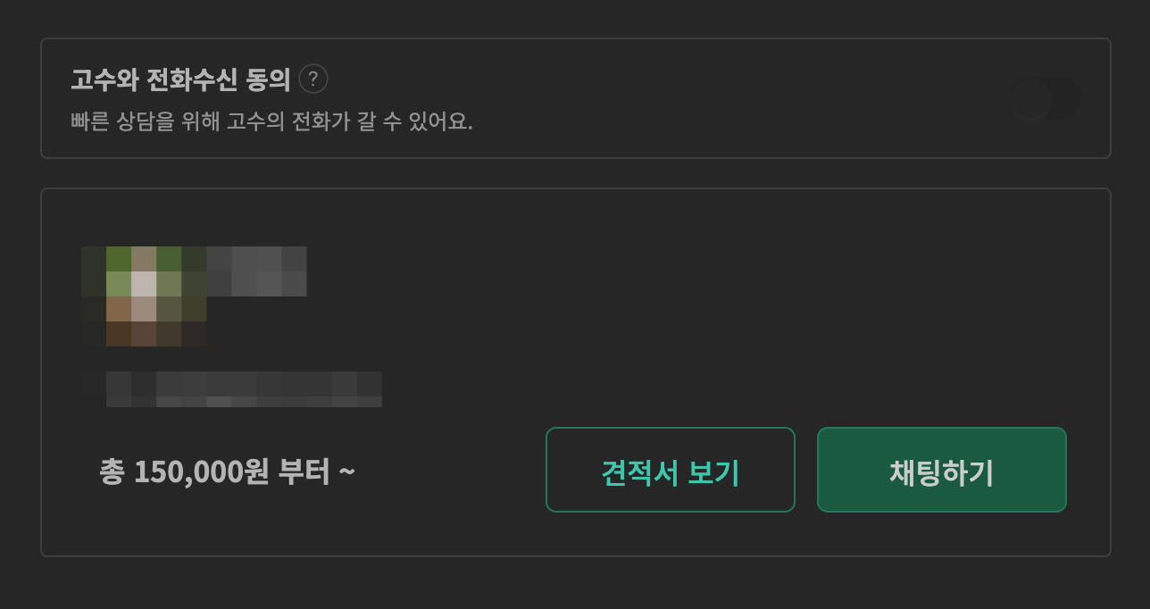 제가 직접 견적을 받아 보았는데요. 사이트에서 바로 입력을 해보았을 때는 150,000부터 가격이 나왔다보니 비슷하구나 생각이 들었는데요. 추가적으로 전문가에게 연락이 온 견적은 100,000원으로 먼저 나왔습니다.