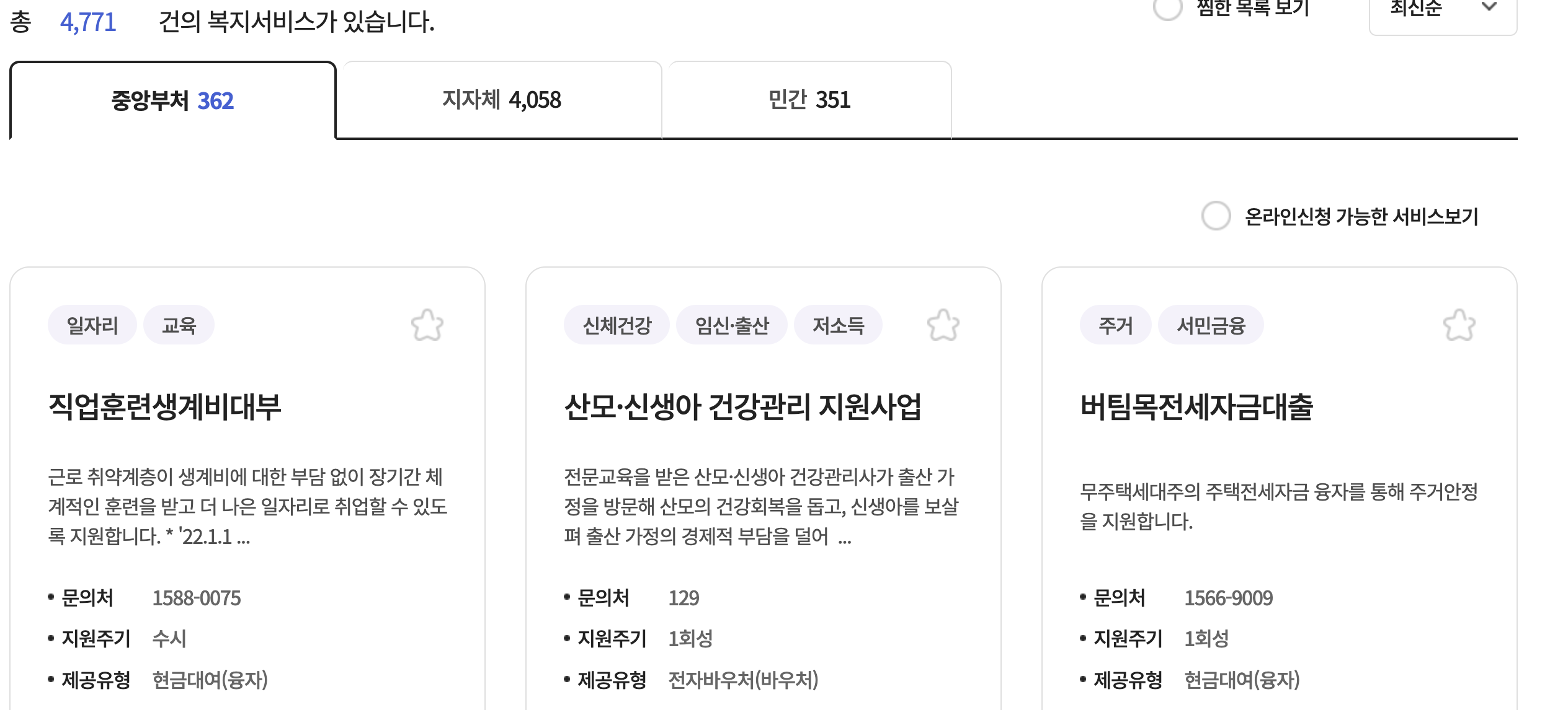 복지로의 복지멤버십에 관련해서 신청할수 있는 지원제도를 보면 포스팅 당일기준 중앙부처 362건, 지자체 4,058건, 민간