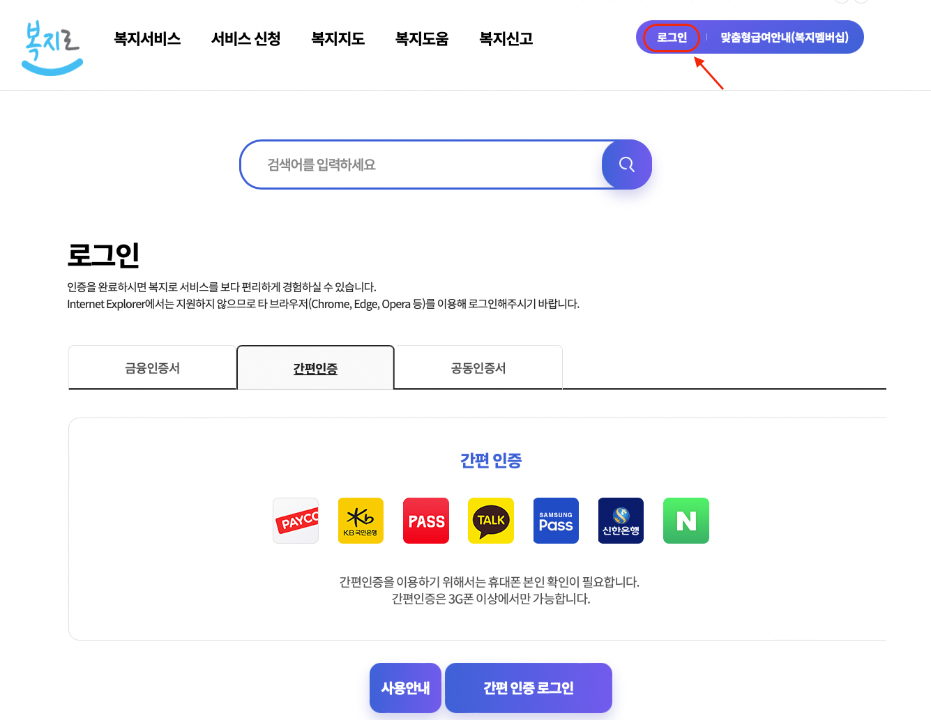 온라인 신청방법은 아래 바로가기 링크를 통해서 가시면 상단에 로그인을 먼저해야합니다. 로그인의 경우 금융인증서, 간편인증, 공동인증서 3가지 방법으로 가능한데요. 최근에 간편인증이 가장 편하고 쉽게 로그인하는 방법입니다. 따로 프로그램 설치나 인증서를 이동하는 불편함 없이 사용이 가능하기 때문에 간편인증 로그인을 추천드리겠습니다.