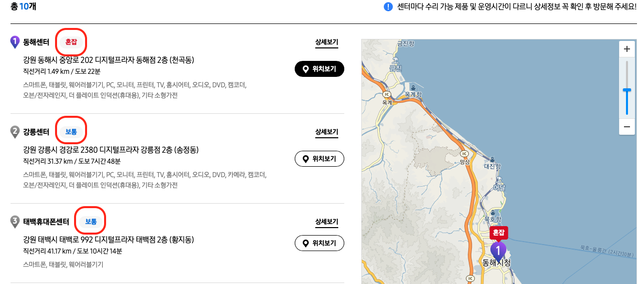 삼성전자 서비스 센터 혼잡도 확인하기로 들어가시면 주변 센터의 혼잡도를 바로 옆에 표시해주어서 확인할 수 있습니다. 혼잡의 경우 대기가 1시간 이상 걸릴 수 있다는 것, 보통은 약간의 대기시간 발생, 원할은 방문하는 대로 바로 서비스를 받을 수 있다는 것을 뜻합니다. 이렇게 방문 전 혼잡도를 확인하고 방문하시는 것을 추천드리겠습니다.