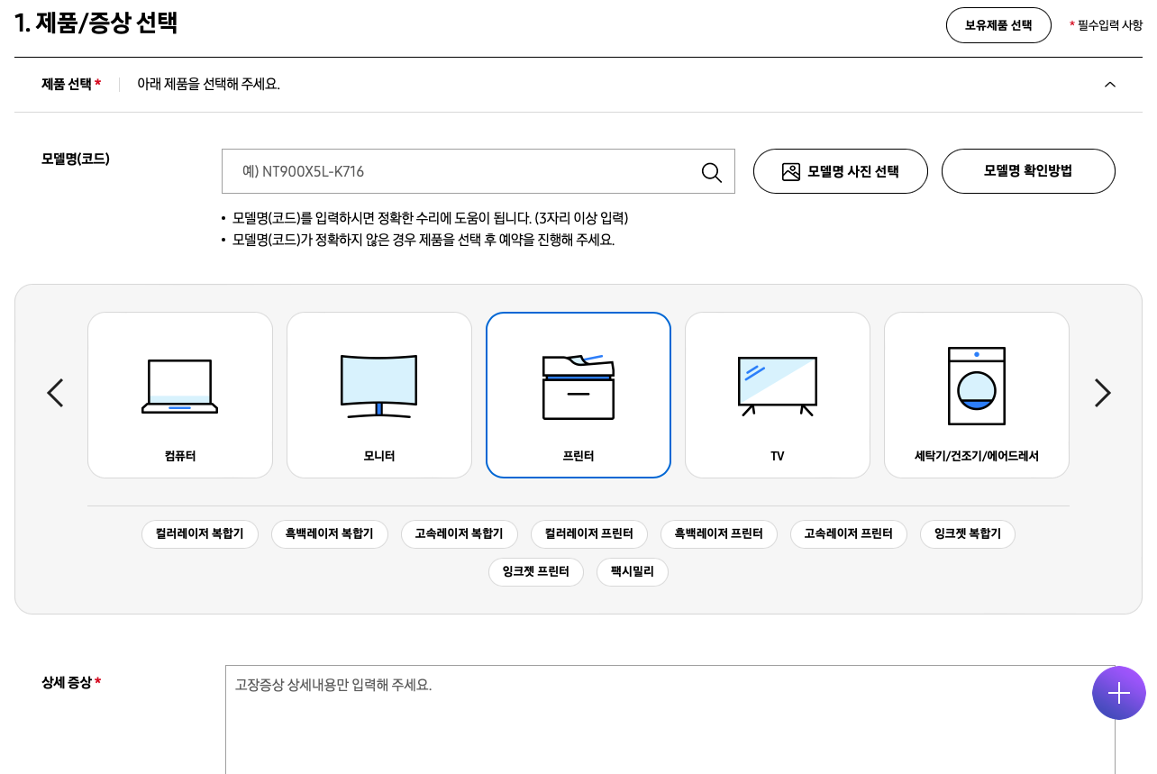 예약방법은 아래 바로가기 링크로 접속하시면 이미지와 같이 제품을 선택하고 모델코드 입력 후 상세증상을 적으시면 됩니다.