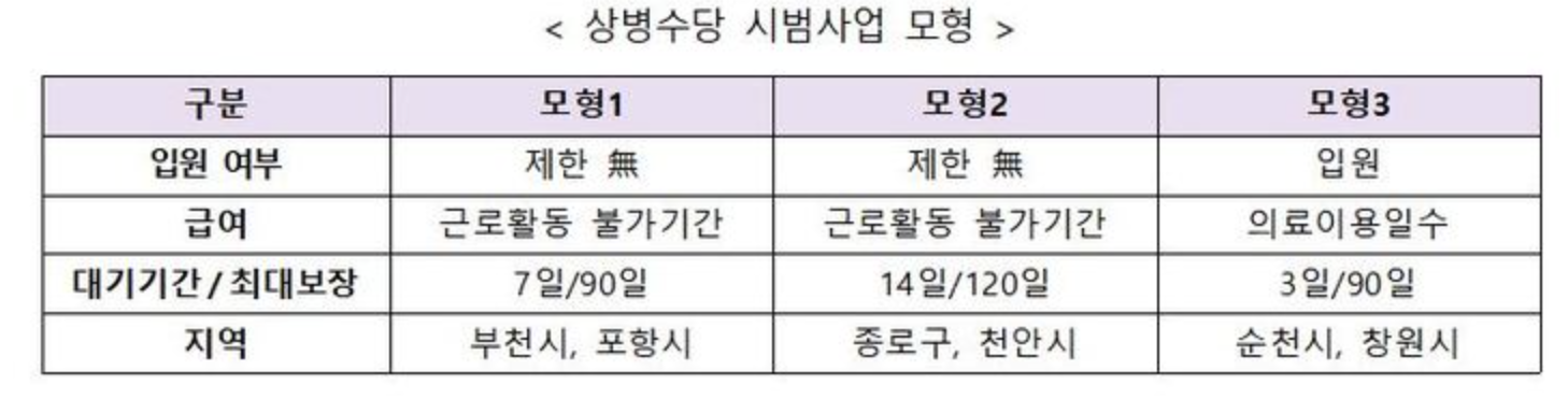 이렇게 1년간 시범사업으로 진행을 하면서 생기는 문제점을 해결하기 위한 부분이 됩니다. 상병수당에 따른 정확한 지원자격과 신청방법은 추후 6월말 발표 예정입니다.