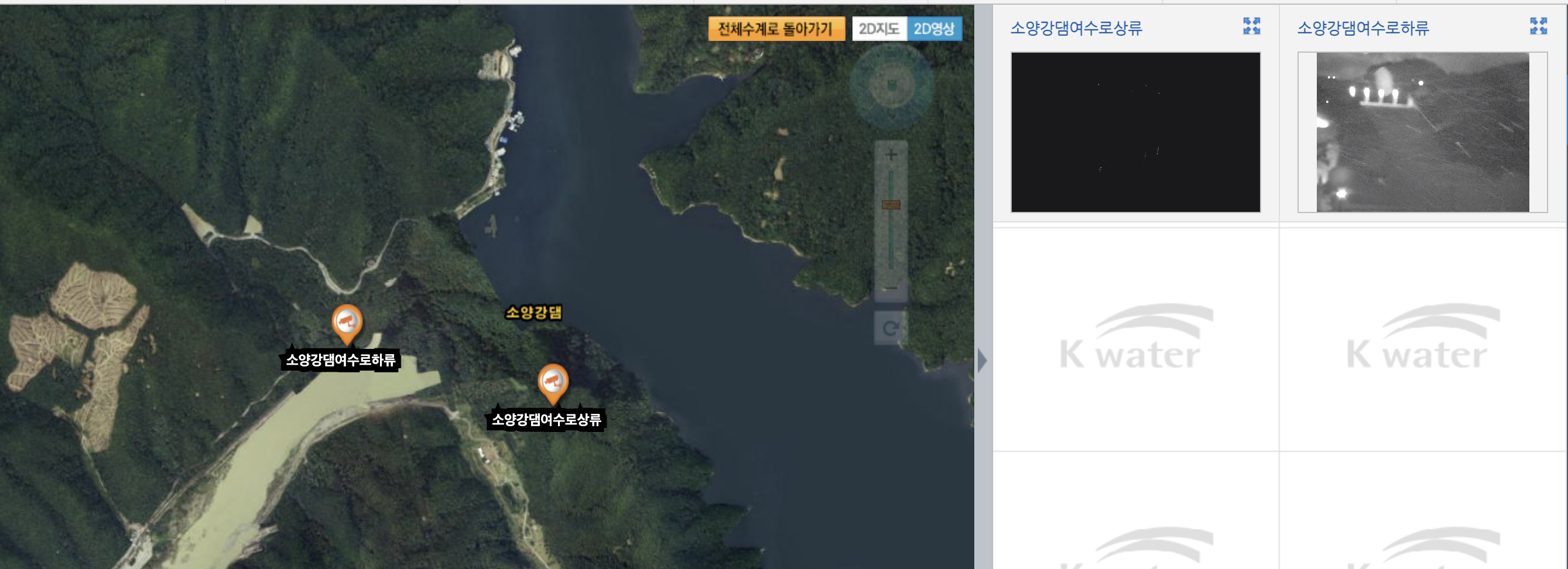 소양강댐은 한강수계에 있는 댐으로 확인을 하셨다면 소양강댐을 클릭하시면 CCTV를 볼 수 있습니다. 소양강댐에 CCTV는 총 여수로하류와 여수로상류 두곳에 위치해있습니다. 옆에 지도와 함께 본다면 그 위치를 좀더 정확히 확인할 수 있어서 좋겠습니다.