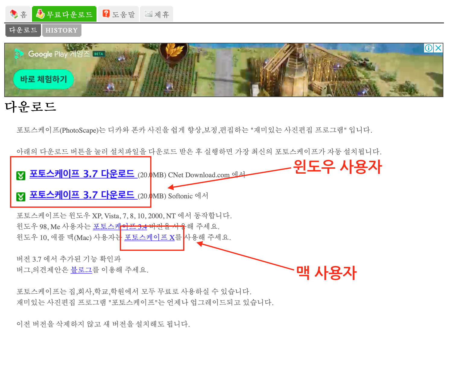 위 링크로 접속하면 윈도우의 경우는 위에 3.7버전을 물론 이 버전은 매번 업데이트가 될때마다 바뀔테지만 중앙에 가장 큰 글씨의 포토스케이프 버전을 받으면 됩니다. 윈도우10, 맥 사용자는 포토스케이프X를 사용하라고 나와있긴 하지만 윈도우 사용자의 경우 포토스케이프X 보다는 포토스케이프 일반 버전을 이용하는 것을 추천합니다.