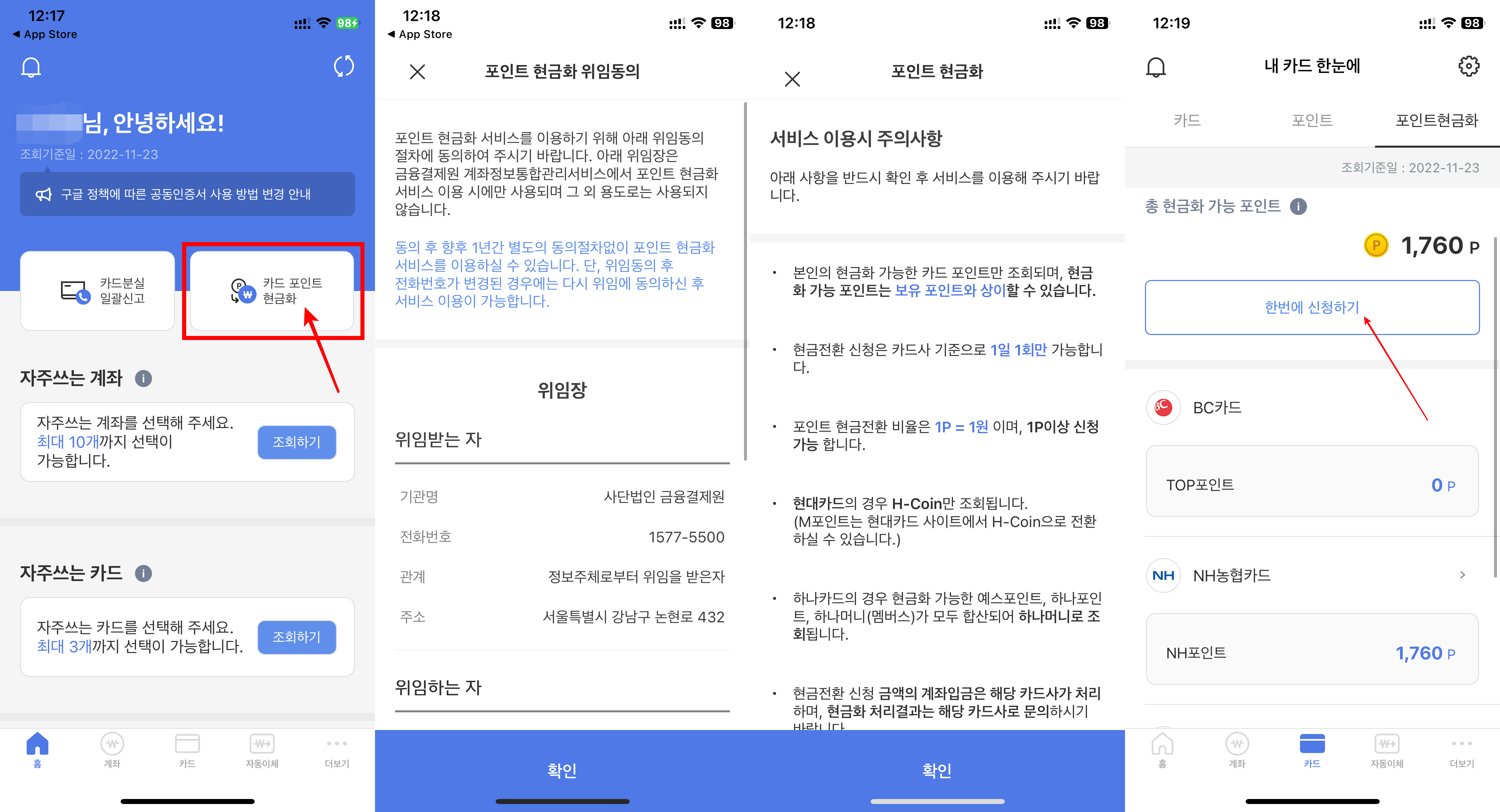 금융결제원에서 지원하는 어카운트 인포에서 카드 포인트를 한번에 모아서 현금화할 수 있는 서비스를 지원하고 있습니다.