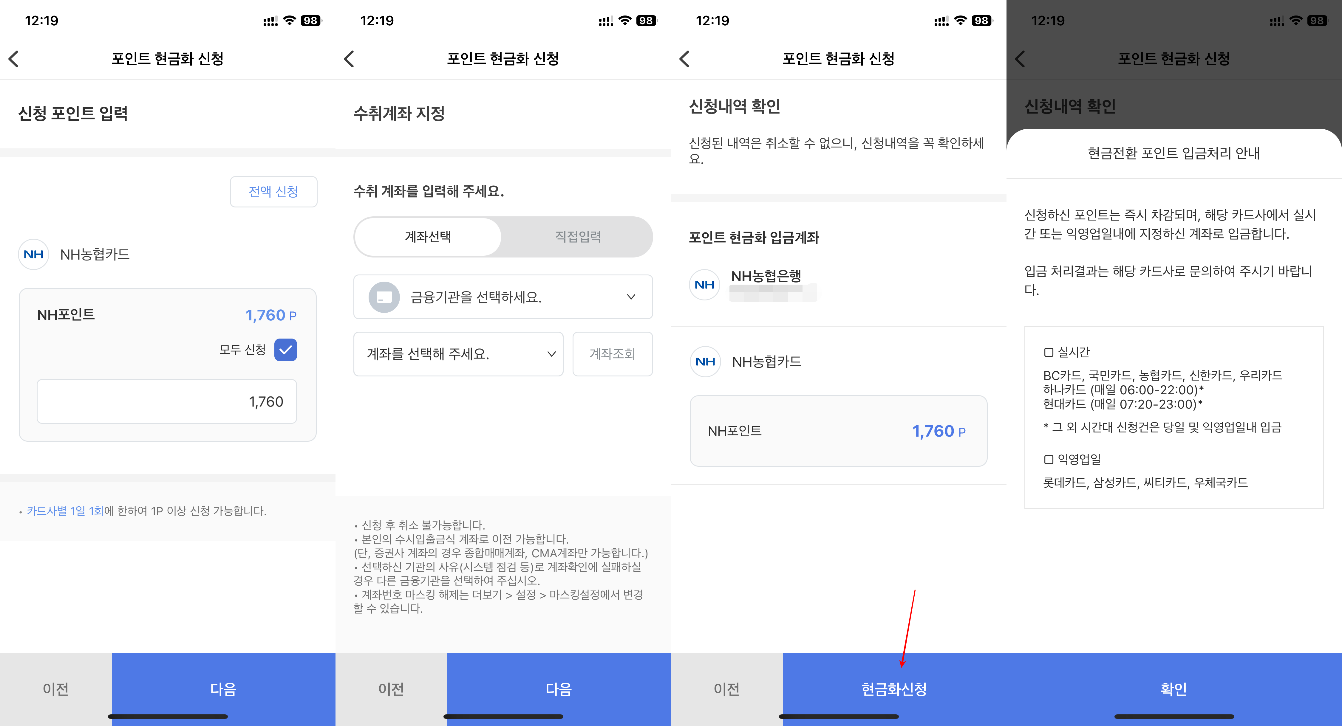 현금화 가능한 포인트를 내가 원하는 만큼 신청하시면 됩니다. 보통은 전액신청해서 한번에 다 받는 것이 좋겠습니다. 수취 계좌는 직접입력과 나에게 등록된 계좌를 바로 쉽게 등록이 가능합니다. 신청은 추가적인 부분없이 바로 신청이 가능하고 바로 차감되고 현금화가 됩니다.