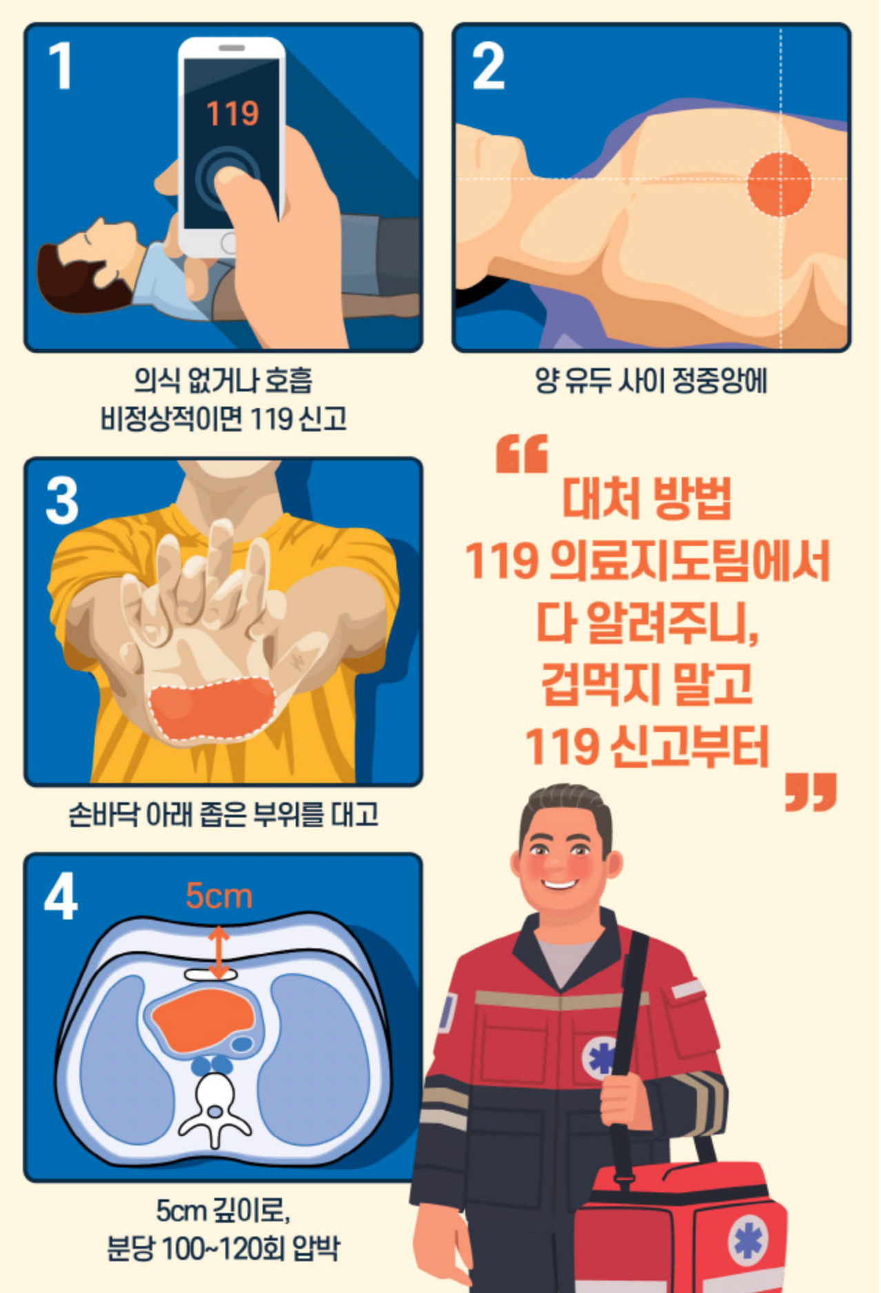 심정지 환자를 발견한다면 응급처치법을 꼭 기억하시고 생명을 구하시길 바랍니다.